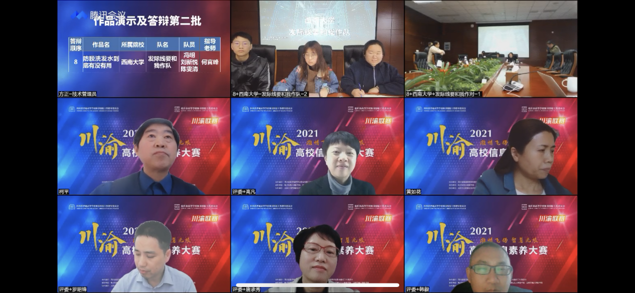 川渝联赛赛段在权威性和专业性上得到了豪华评委阵容的强力加持,由南开大学柯平教授、武汉大学黄如花教授、西南大学韩毅教授、西南交通大学高凡教授、天津财经大学唐承秀研究馆员、中国科学院罗昭锋研究员六位专家组成评委团。比赛当天,来自川渝地区十所高校的十支队伍三十名选手相聚云端,上千名观众线上观赛,共同见证了这场川渝高校的盛赛。