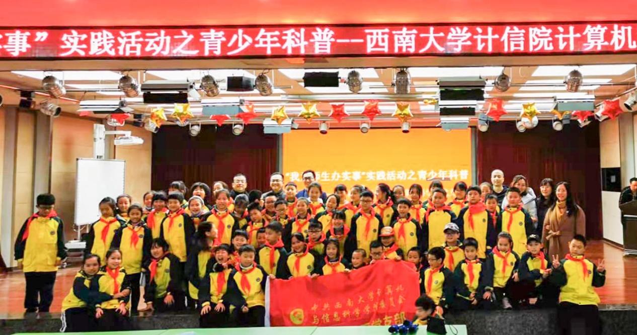 附属小学党委书记张旺,计算机与信息科学学院党委书记靳拥军,科普讲座报告人、计算机与信息科学学院黄兵姚教授,计科系党支部的党员教师和附属小学五年级全体学生参加此次活动。