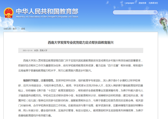 近日,学校提升云南省昌宁县基础教育水平,推进乡村振兴建设工作受到教育部一线采风栏目的报道,相关内容由国内合作处、党政办公室报送。教育部网站报道原文如下: