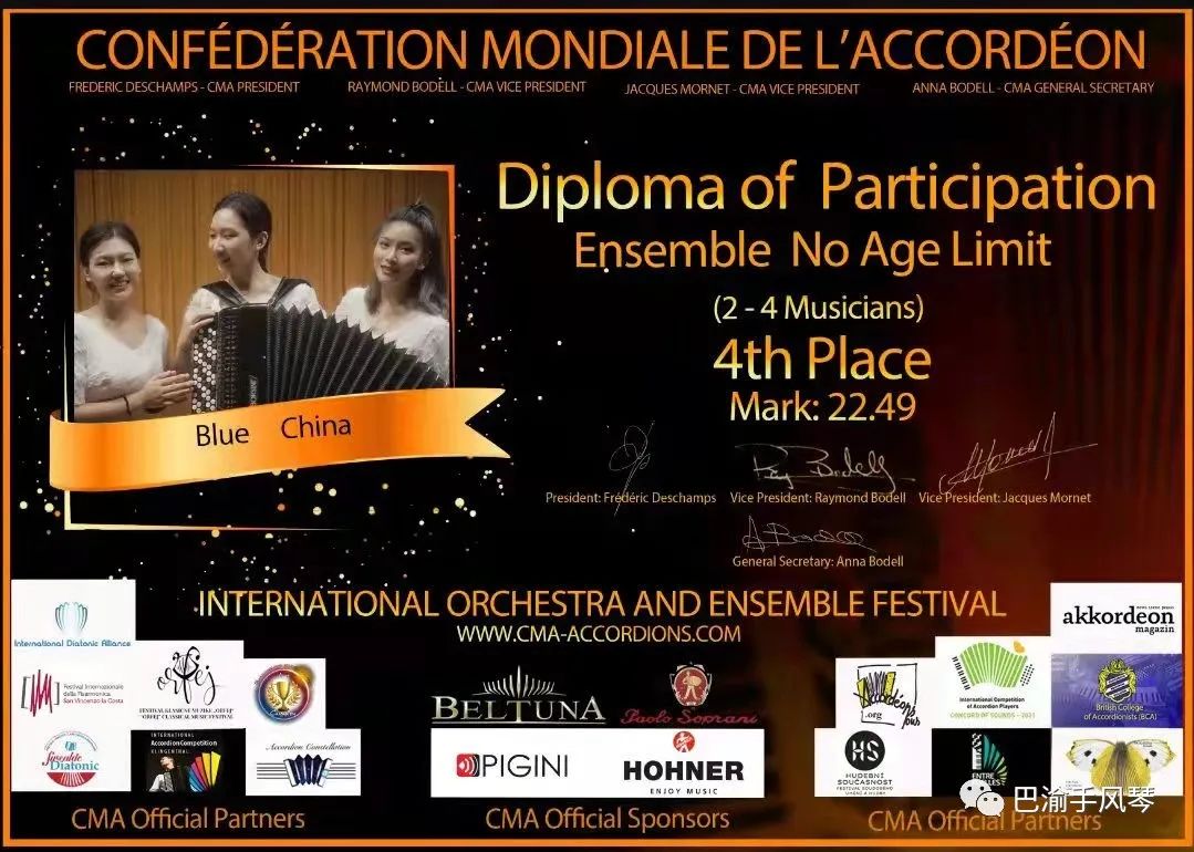 据悉,CMA(Trophée Mondial)世界手风琴锦标赛是当今最权威的国际手风琴比赛之一,同德国克林根塔尔国际手风琴比赛、意大利卡斯特费达尔多国际手风琴比赛、世界杯手风琴比赛、西班牙阿拉萨特国际手风琴比赛并称为五大国际手风琴比赛。