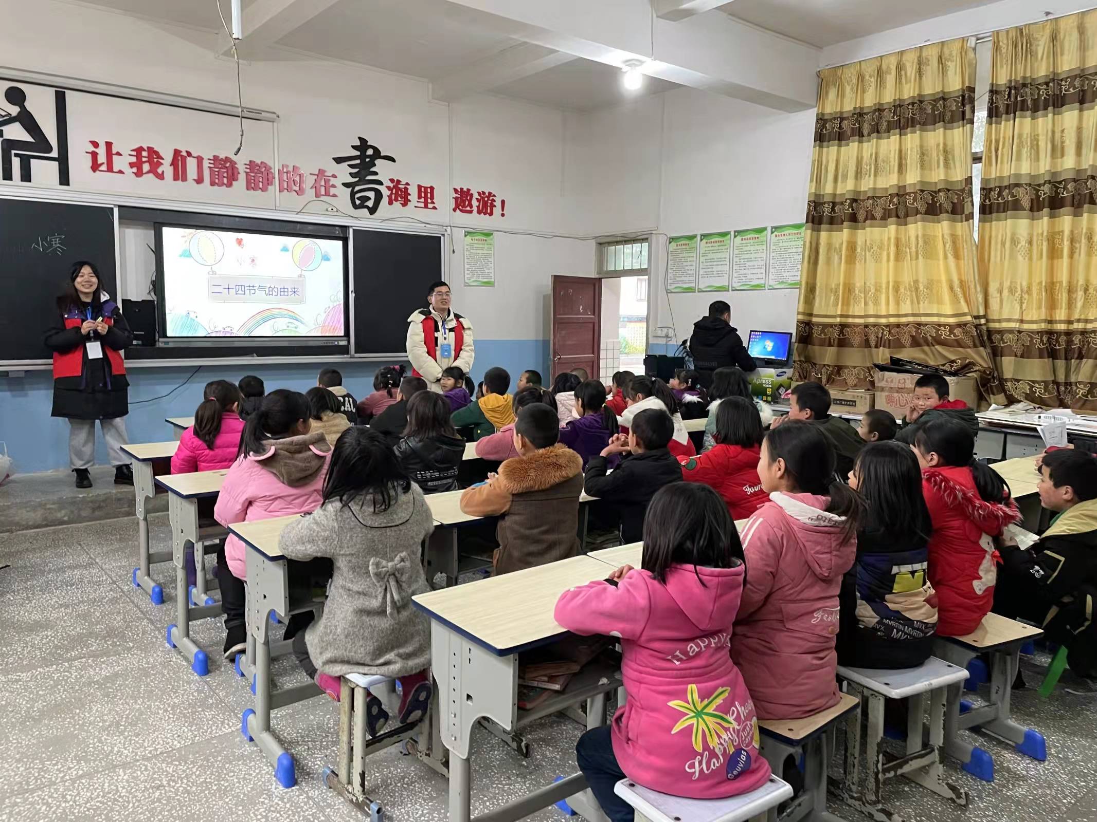 罗宁、张可秋两位志愿者将“二十四节气”浓缩为一场生动活泼的美景美食盛宴,结合“节气歌”击鼓传花游戏,激发他们对中华传统文化的兴趣。李玉萍、李雨晴和李怡洁三位志愿者趣味科普“八大行星”,以童谣将孩子们引入浩瀚无垠的宇宙,让他们初步了解八大行星、尝试组装八大行星模型,在轻松愉快氛围中收获天文知识。张嘉敏和玉波香两位志愿者以“祖国家园有什么”为题介绍中国,带领孩子们领略祖国的锦绣河山和秀美风光。通过拼图游戏加深孩子们对祖国的了解,初步培养他们的地理素养和国家观念。彭雅丽、刘菊两位志愿者带领孩子们重走“西游”之路、品味沿途的风土人情,让他们从古典名著中品味玄奘不畏艰险的精神、掌握相应历史地理知识。志愿服务队还分赴两个贫困家庭进行家访,为他们送去物资和问候,并向家长宣传助学政策,鼓励孩子们努力学习、志存高远。