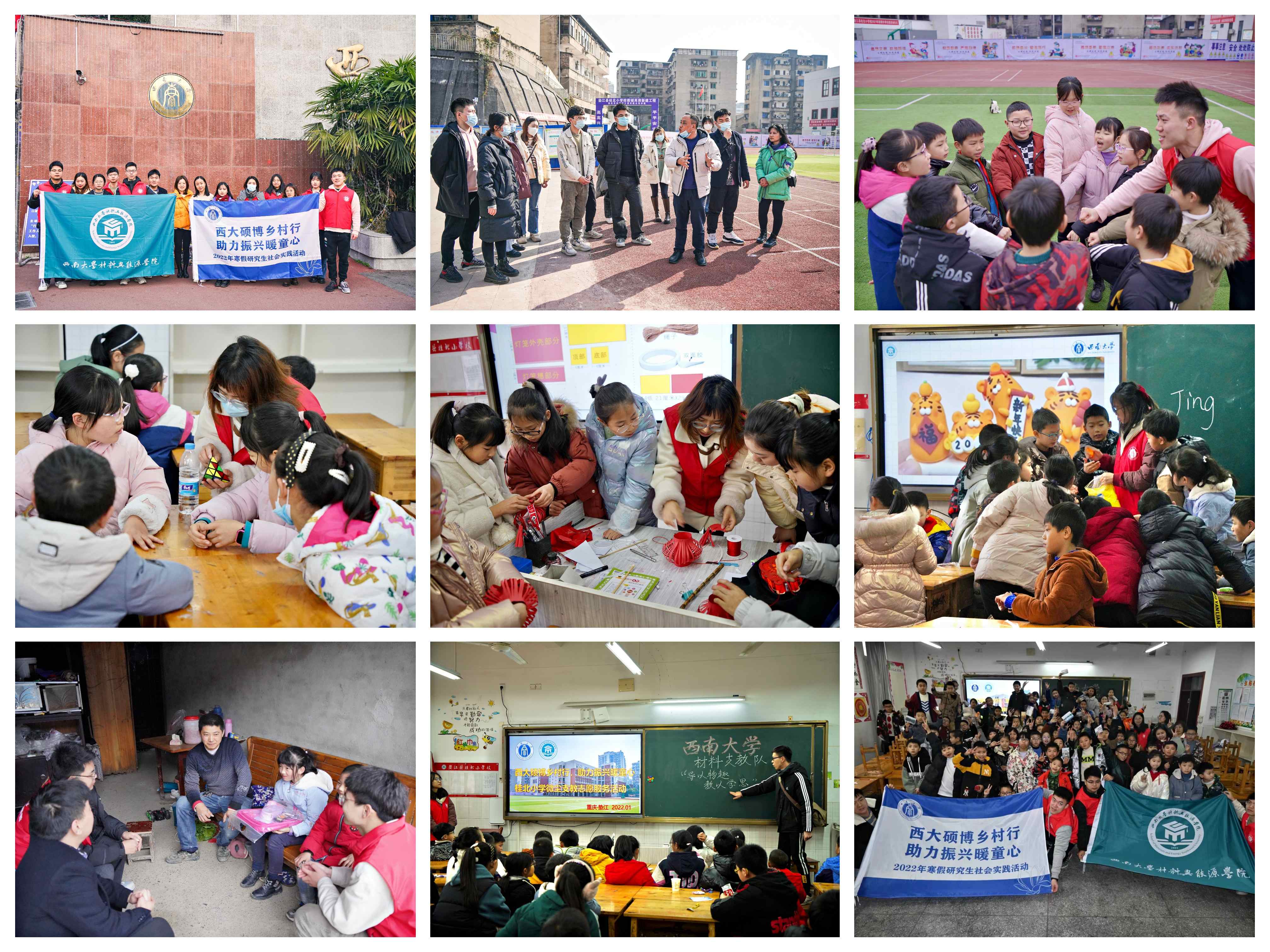 编者按:为充分发挥学校科技人才优势,引导研究生正确认识科学研究、理论成果与解决社会实际问题的关系,主动肩负起时代责任和历史使命,将个人研究服务于经济社会发展和广大人民群众,着力增强研究生实践能力、创新能力,全面助推乡村振兴战略,2022年寒假,党委研究生工作部继续组织开展“百所山村小学计划”研究生社会实践活动。本次活动的主题为“西大硕博乡村行,助力振兴暖童心”,共组建31支校级研究生实践团队奔赴重庆市内各区县开展送教下乡和留守儿童帮扶等形式多样、内涵丰富的社会实践活动,切实强化新时代研究生的使命担当,以丰硕的实践成果迎接党的二十大胜利召开。