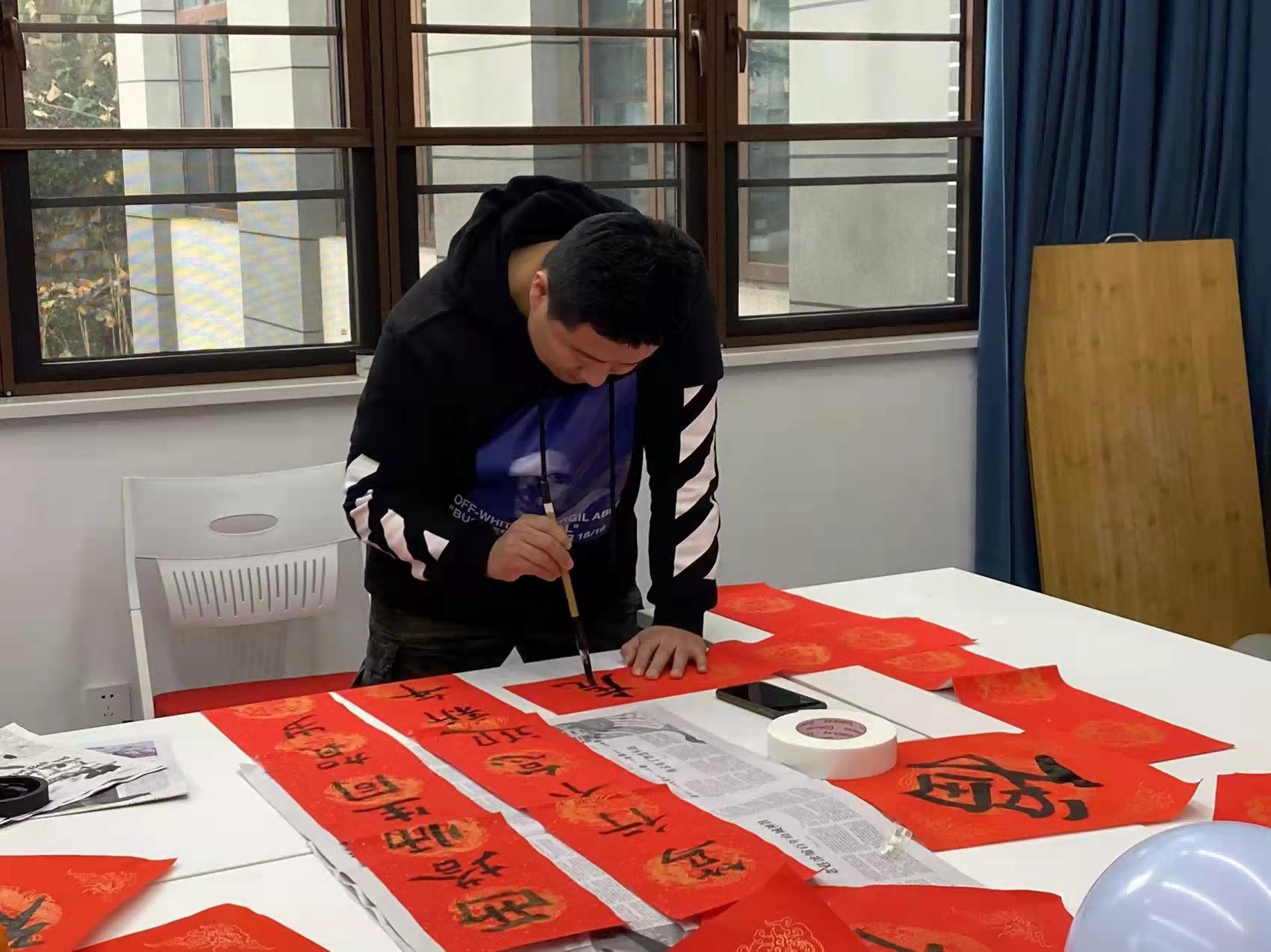 在暖意融融的室内,学院领导老师们正和留校同学们愉快地交流着,场内一片欢声笑语。在场的老师和同学们纷纷跃跃欲试,纷纷铺纸、润笔、倒墨……乐乐呵呵地动起手来。在场的每位老师和同学都在春联上写下了自己的新年祝福:有的是“虎虎生威”的福,有的是“萌萌小虎”的福,有的是对学院和新年“心意满满”的新春祝福……随后,老师和同学们开始一起擀皮、包饺子让虎年更有“年味”。