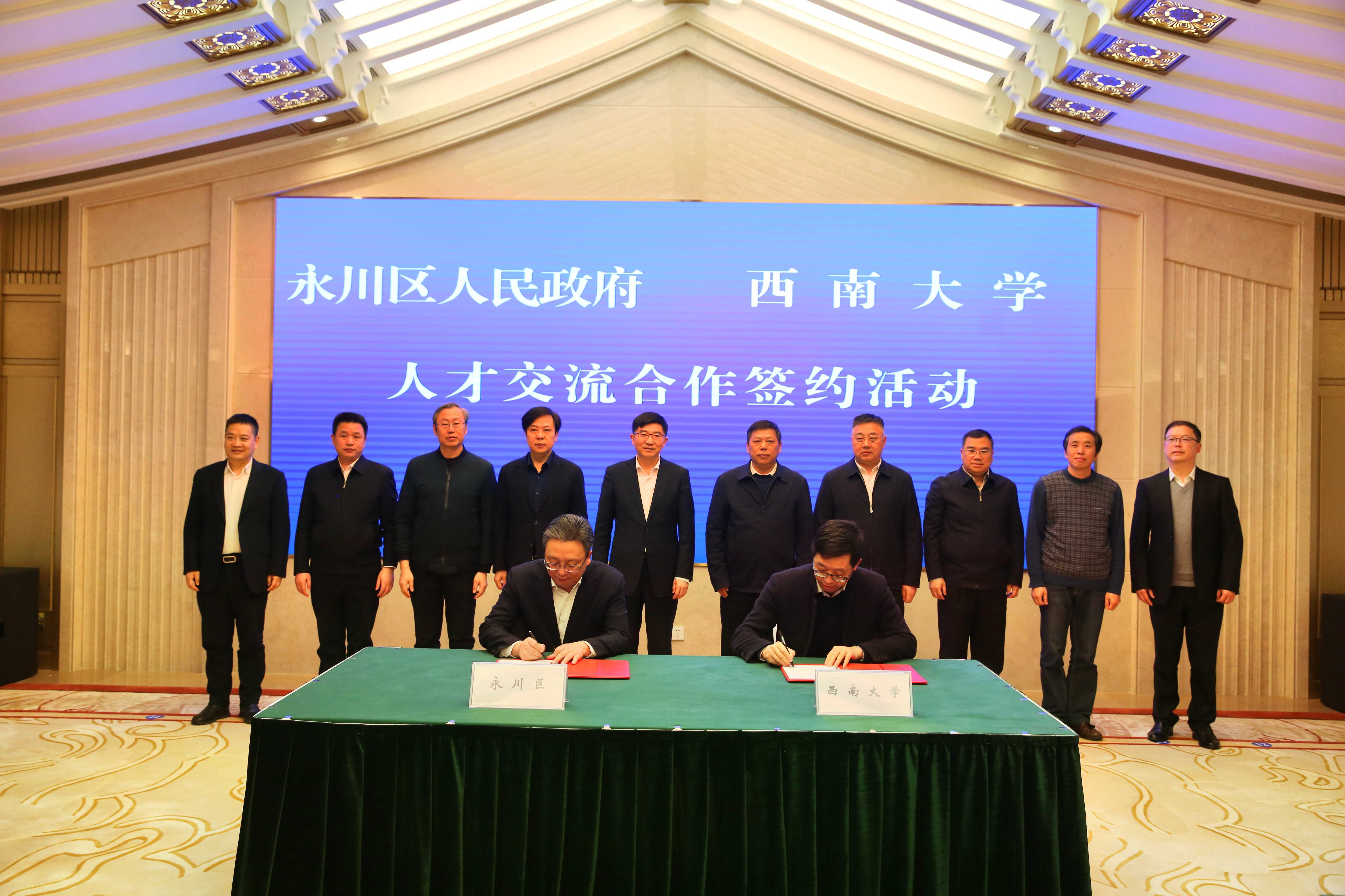 为进一步深化与永川区校地合作,2月22日,校长张卫国带队赴永川区考察交流,商讨在科技创新、乡村振兴、人才交流、教育培训等领域开展合作,并签订人才交流合作协议。永川区委书记张智奎,区委副书记、区长常晓勇,区人大常委会主任潘文峰,区政协主席文良印,区委副书记蔡焘等区领导,西南大学党委副书记安春元,副校长赵国华等出席签约仪式。