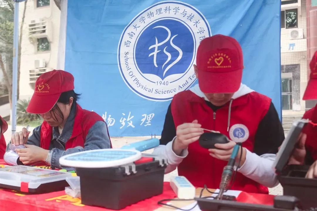 原来,这是学校物理科学与技术学院的“红帽子”青年志愿者服务队在为全校师生免费维修家用电器。此次活动共有40余名志愿者参与,服务内容包括电脑维修、购机指导、电脑知识科普以及入寝维修等。志愿者们还拿出精心编写的《大学生小家电维修手册》,向大家普及一些基础的保养维修小知识。