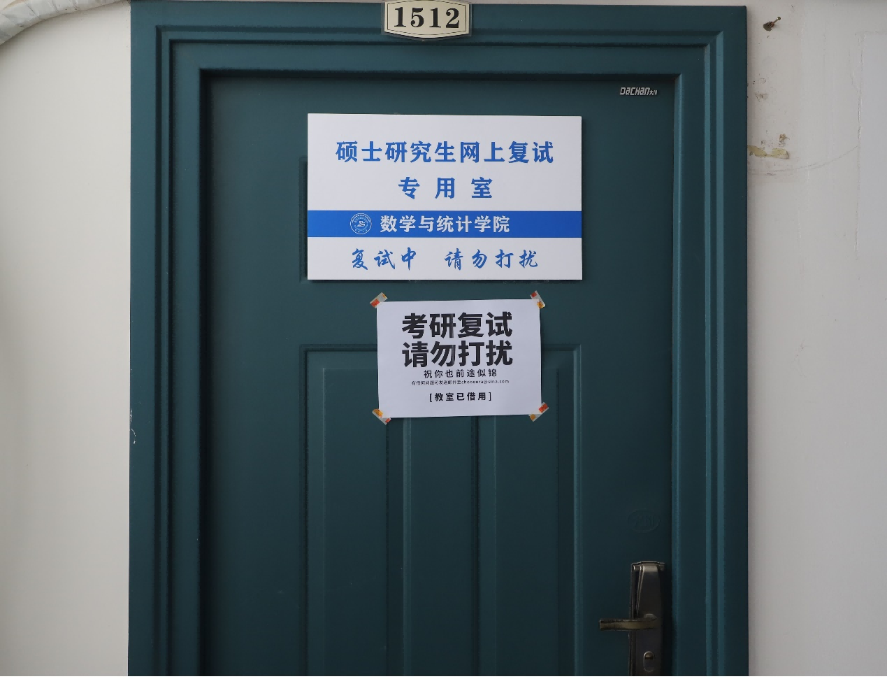 为解决考生线上复试场地、设备、技术方面的困难,数学与统计学院专门采购和调用学院资源,将25教1512、1513两间教授办公室临时作为考生网上复试专用房间,配置高清摄像头、专用话筒、台式电脑和音响等设备,解决场地、设备等方面的实际问题,保障考生顺利参加复试。参加复试的各考生可以根据复试的具体时间安排,在辅导员处预约登记使用复试专用房间。