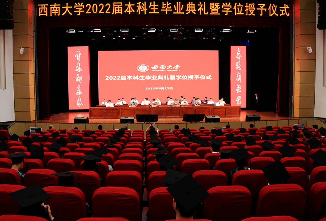 学业有成正青春,韶华不负向未来。6月23日上午,学校在北碚校区第一运动场和荣昌校区学生活动中心同步举行2022届本科生毕业典礼暨学位授予仪式。全体毕业生通过现场参加或云端观礼方式,在师长亲朋见证下,拨穗正冠,顺利毕业。