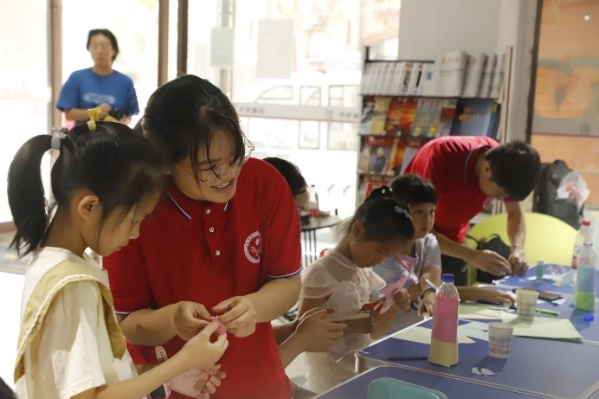 实践团来到北碚区正码头市民驿站,开展“节能减排进社区,减碳思想入人心”趣味健谈教育活动。实践团成员用通俗易懂、幽默风趣的语言为小朋友们介绍碳中和与二氧化碳知识,并和小朋友们一起用水瓶和树叶进行“变废为宝”的手工制作。