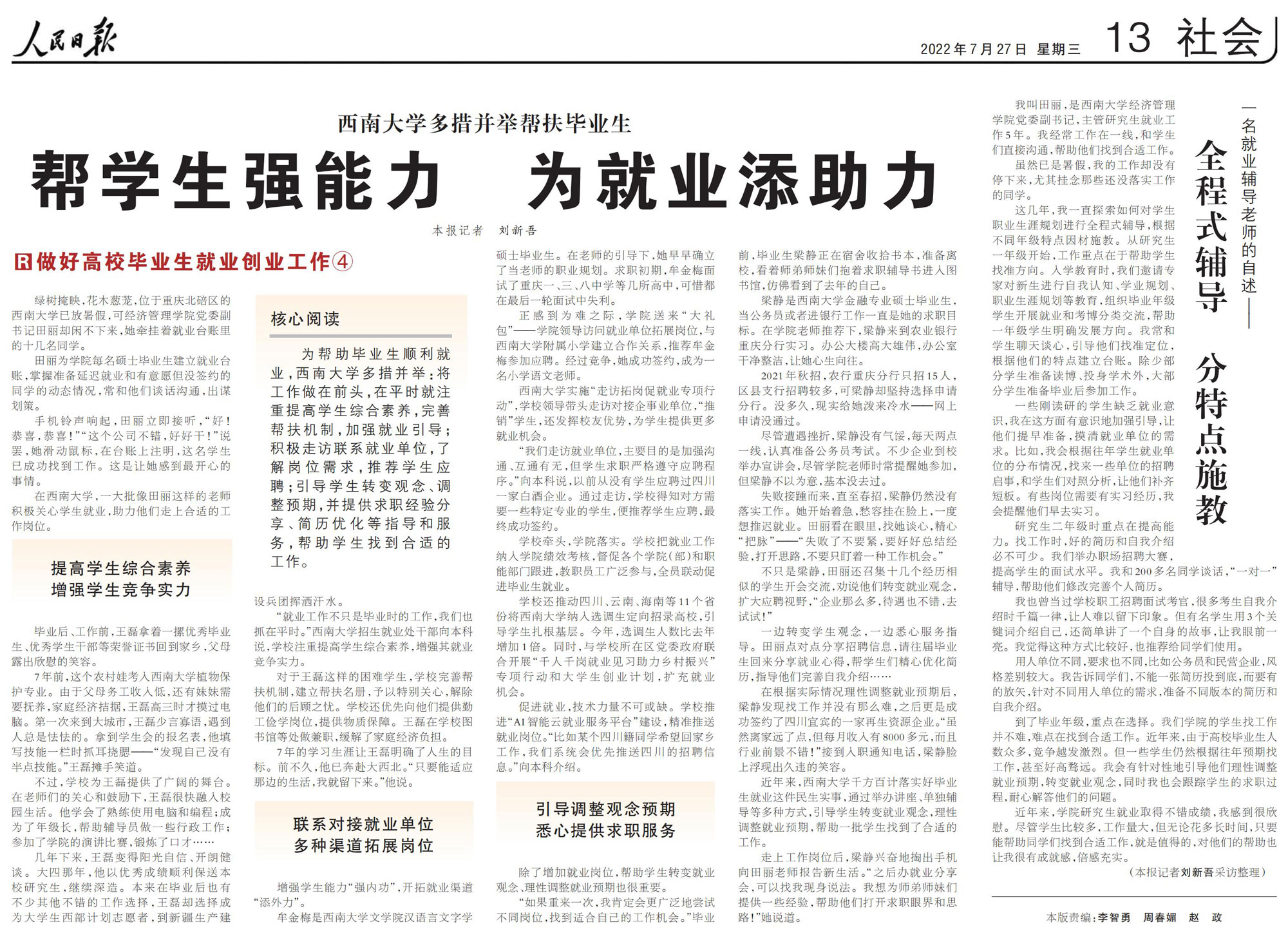 2022年7月27日《人民日报》第13版,以《帮学生强能力 为就业添助力——西南大学多措并举帮扶毕业生》《全程式辅导 分特点施教——一名就业辅导老师的自述》为题报道点赞西南大学做好高校毕业生就业创业工作,半个版数千字浓缩了师生为就业创业共同努力的奋斗历程,展现了学校教育战线将立德树人扎根融入日常工作的众多感人瞬间,诠释了一所大学从育人、助人到成人的教育理念和使命担当。将工作做在前头,将台账摆在案头,将学生记在心头,西南大学就业工作同育人工作紧密链接,以全员全过程全方位育人格局为学生就业创业保驾护航,人民日报的点赞更加激发了全体教师员工干事创业信心,提振了广大学子担当作为精神,全文报道如下: