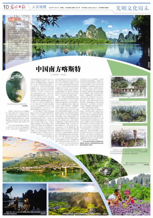 7月24日,《光明日报》整版刊登《中国南方喀斯特》,带领读者一起走近中国南方喀斯特,领略大自然的鬼斧神工,同时也介绍了学校在袁道先院士带领下开展的科学开发保护工作。具体内容如下: