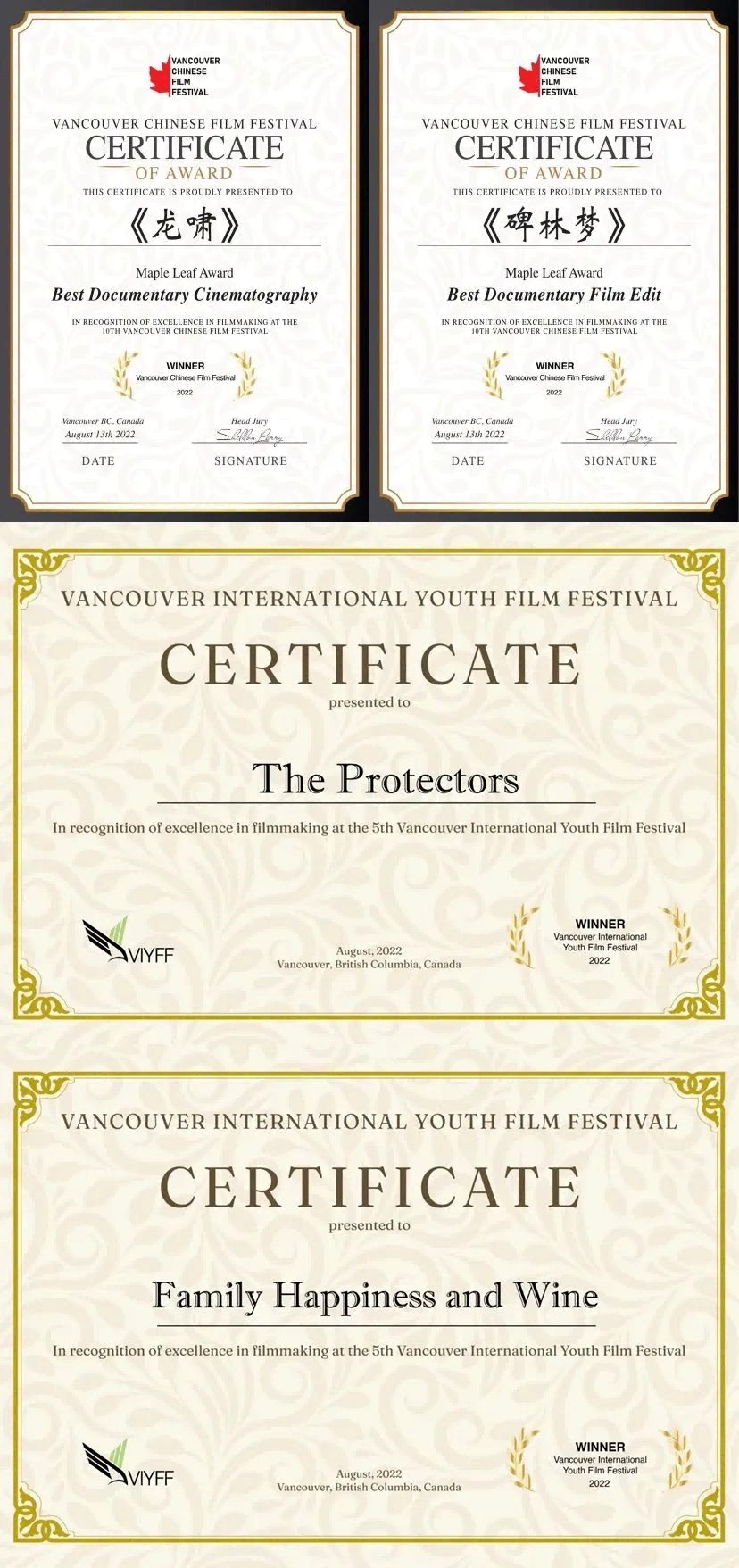 2022“看中国·重庆行”12部影片全部入围第十届温哥华华语电影节“红枫叶奖”。《碑林梦》荣获第十届温哥华华语电影节“最佳纪录片剪辑奖”,《龙啸》荣获第十届温哥华华语电影节“最佳纪录片摄影奖”,《福荫》和《酒酿重庆》荣获第五届温哥华国际青年电影节“杰出制作奖”,同时《碑林梦》《龙啸》《酒酿重庆》《旭日东升》《夏布新生》《不漆而遇》六部影片在电影节开幕式展映。