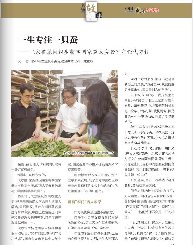 近日,《当代党员》2022年18期以《一生专注一只蚕——记家蚕基因组生物学国家重点实验室主任代方银》为题,报道了学校代方银教授潜心育人治学事迹,原文如下。