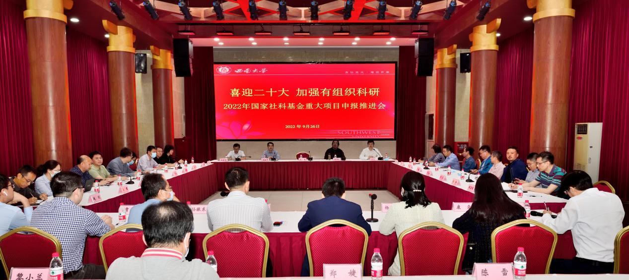 为喜迎党的二十大,加强有组织科研,9月26日上午,学校召开2022年国家社科基金重大项目申报推进会。副校长崔延强出席会议,各二级人文社科教学科研单位、校级科研机构分管科研负责人、拟申报2022年国家社科基金重大项目团队首席专家、社会科学处相关人员参加会议。