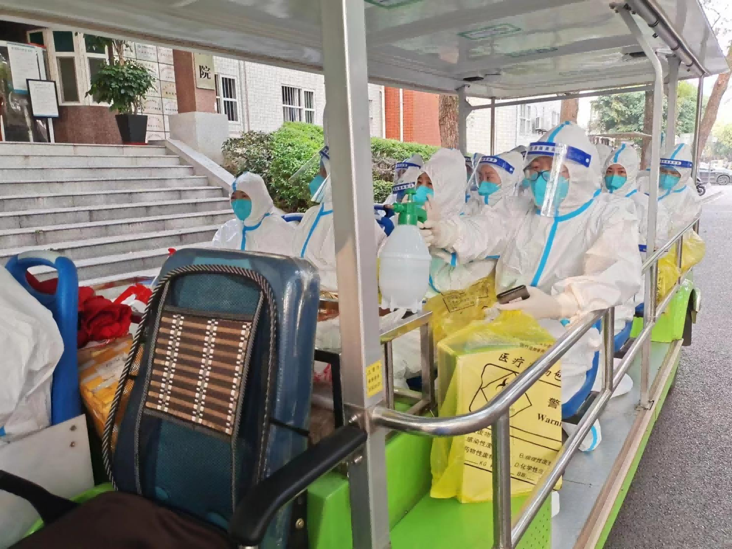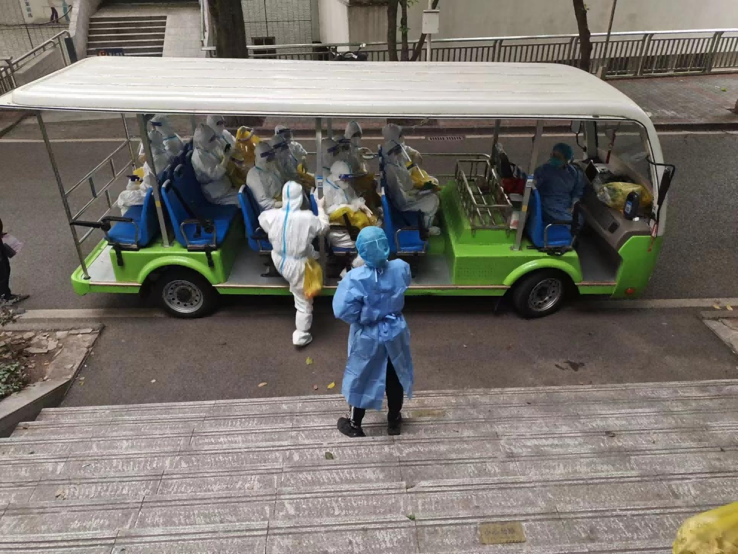 一大早,周师傅和胡师傅就开始忙碌起来,把当天奔赴学校各个园区的校医院防疫人员接送到指定的位置。今年重庆的11月份,气温偏高,穿着防护服的他们,身上汗水直淌,仍然安全顺利地完成了学校交办的各项任务,他们每天还要运送大量的防疫物资,满足各个核酸检测点的防疫物资需要,经常要工作到深夜,为校医院临时安排的采集任务提供交通服务。