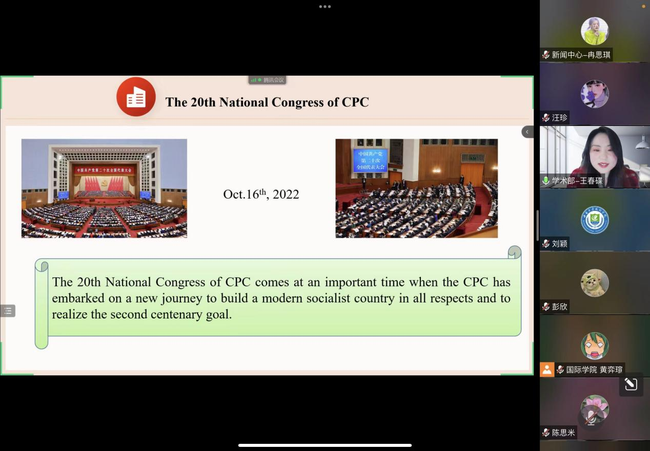 当日,一场别开生面的双语宣讲交流会也通过在线平台顺利举行。依托国际学院“缙云知华大讲坛”,外国语学院研究生双语理论宣讲团为来华留学生带来了一场题为“讲好中国故事,传播中国声音”的国情教育交流分享。宣讲团成员王春碟向与会留学生们介绍了党的二十大召开的背景和基本情况,以“一带一路”倡议、塞罕坝精神、“校长妈妈”张桂梅等生动事例,着重对党的二十大报告中有关“促进世界和平发展”“科教兴国”和“绿色发展”三个方面的重要部署进行了宣讲。在此基础上,与会留学生们结合在华见闻,与宣讲团成员进行了深入交流。王春碟在交流会后的总结反思中回忆道,“对于我来说,这次交流会既是挑战,更是收获。运用外语讲述中国故事,应该成为每一位外语学人的使命担当”。