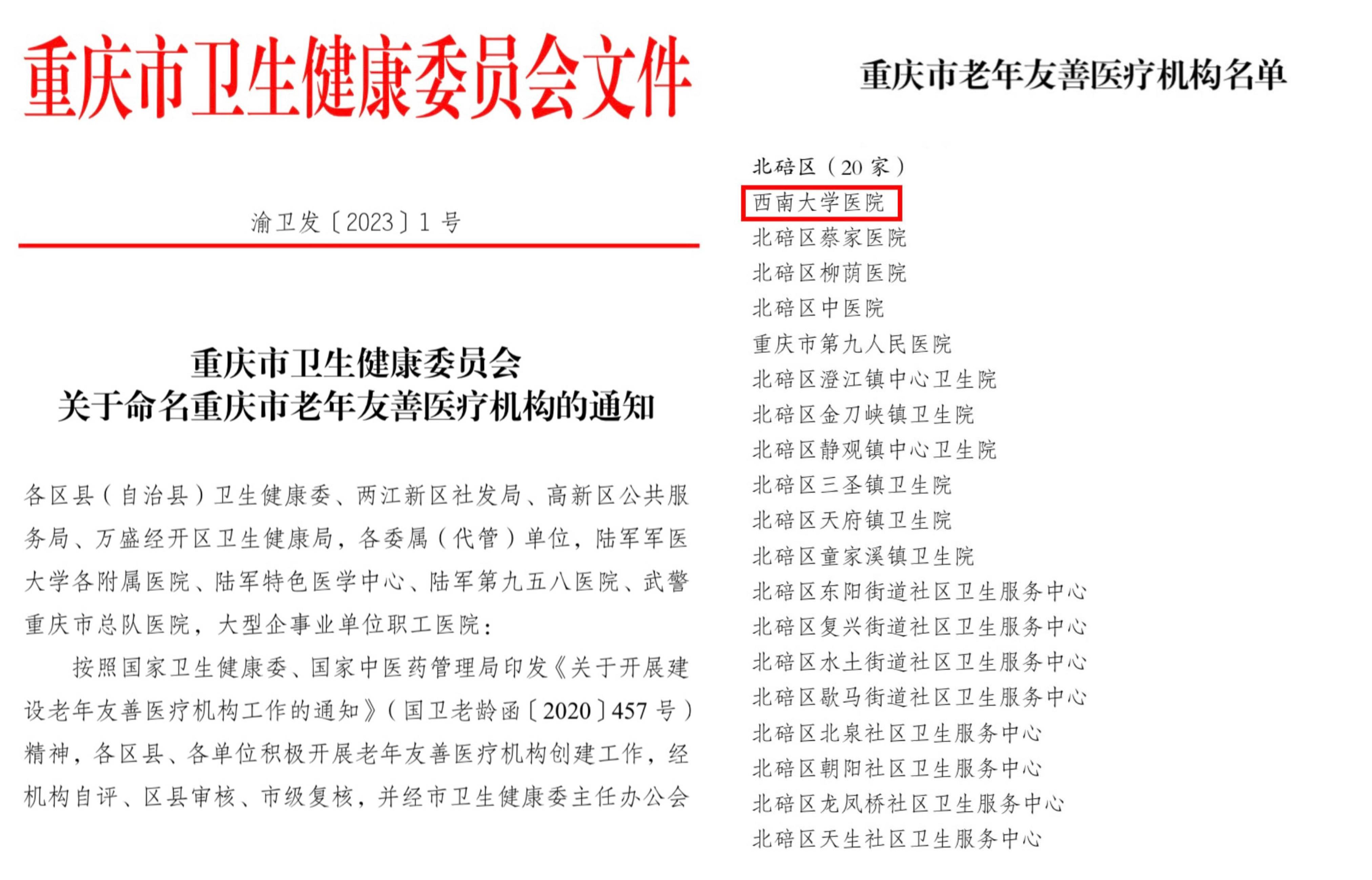 近日,重庆市卫生健康委员会命名全市946家医疗机构为“重庆市老年友善医疗机构”。其中,北碚区20家医疗机构上榜。西南大学医院是北碚区唯一创建成功的二级公立医院,同时也是重庆市高校医院中唯一获评医院。