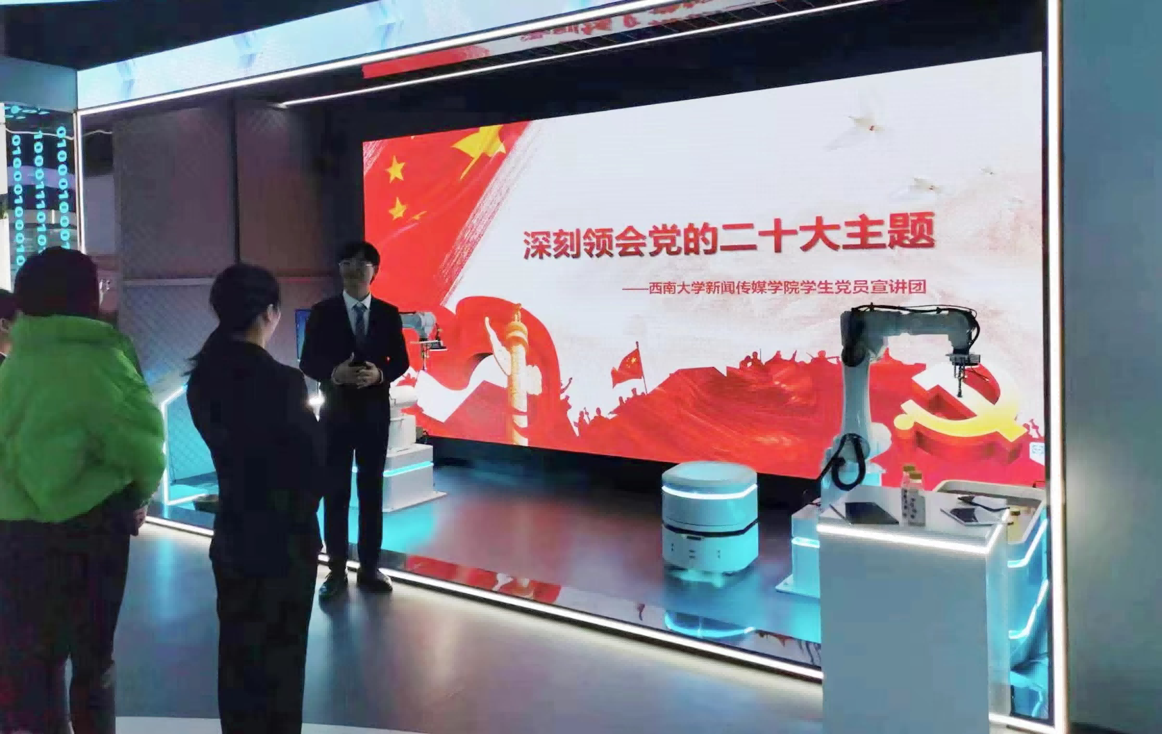 寒假期间,一批宣讲团成员还就近深入家乡社区或实习的企事业单位一线,传递党的二十大精神青年声音。廖鑫宇在重庆沙坪坝区中心湾社区开展院坝宣讲,从北京冬奥会的中国浪漫到《流浪地球》的全球热映,深入浅出地给居民们讲述了文化自信的丰富内涵、精神实质和重大意义。王艺瑾来到河南省焦作市马村区人民医院,通过丰富详实的数据、人物、事例,和医务工作者们分享了自己对“中国式现代化的中国特色”的理解认识。吕杰在湖北武汉江岸区良友红坊文化艺术社区和青年大学生、青年创业者们就党的二十大主题中蕴含的“自信自强、守正创新,踔厉奋发、勇毅前行”16字精神内涵进行宣讲交流,共同砥砺青年时代品格,共筑青年强国梦。郑广淼在所实习的中国移动重庆有限公司担任展厅讲解员,他将党的二十大精神宣讲融入特设党建星火版块讲解,不断在讲中学、在学中总结反思凝练提升。