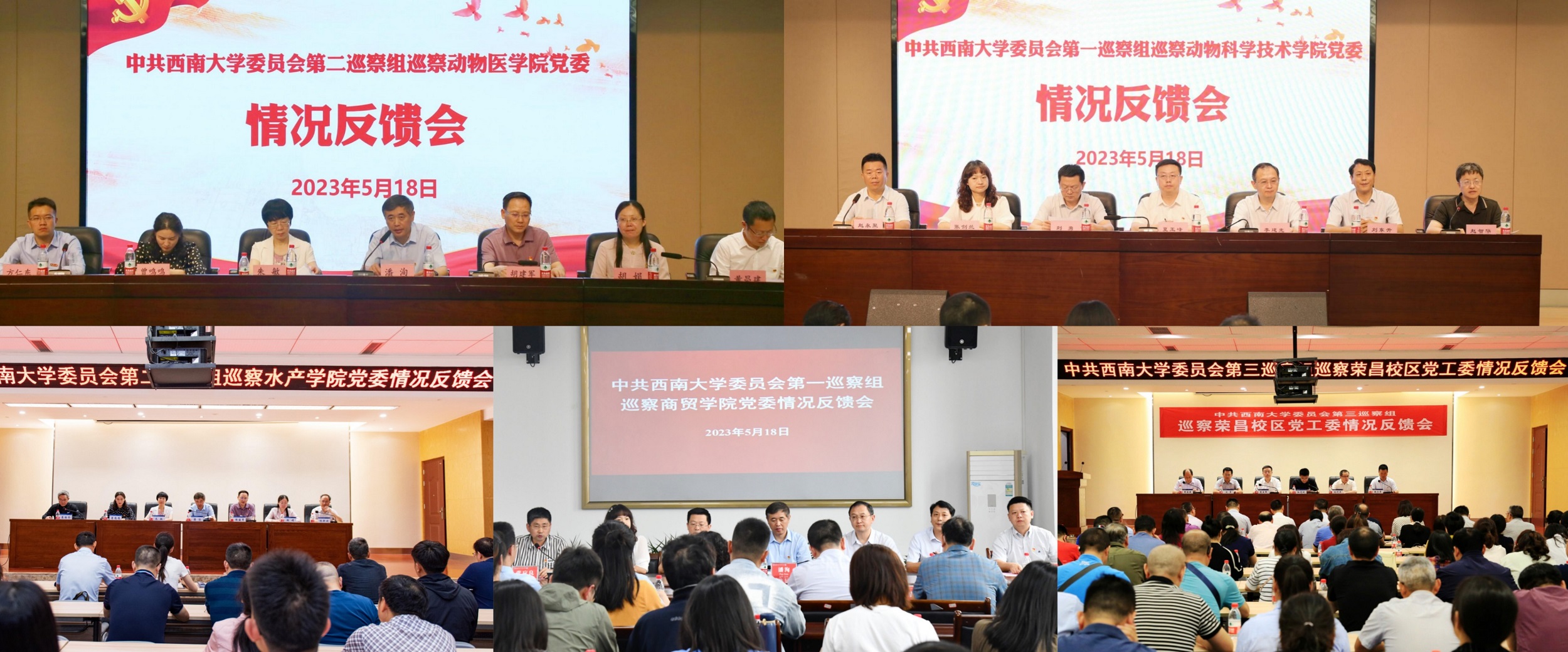 反馈会上,巡察组分别向荣昌校区党工委(机关党总支、离退休党委、基础部党总支)、商贸学院党委、动物科学技术学院党委、动物医学院党委、水产学院党委反馈了巡察总体情况,指出了各单位在党的政治建设、全面从严治党、领导班子建设、基层党组织建设、事业发展等方面存在的问题,并提出明确整改意见。