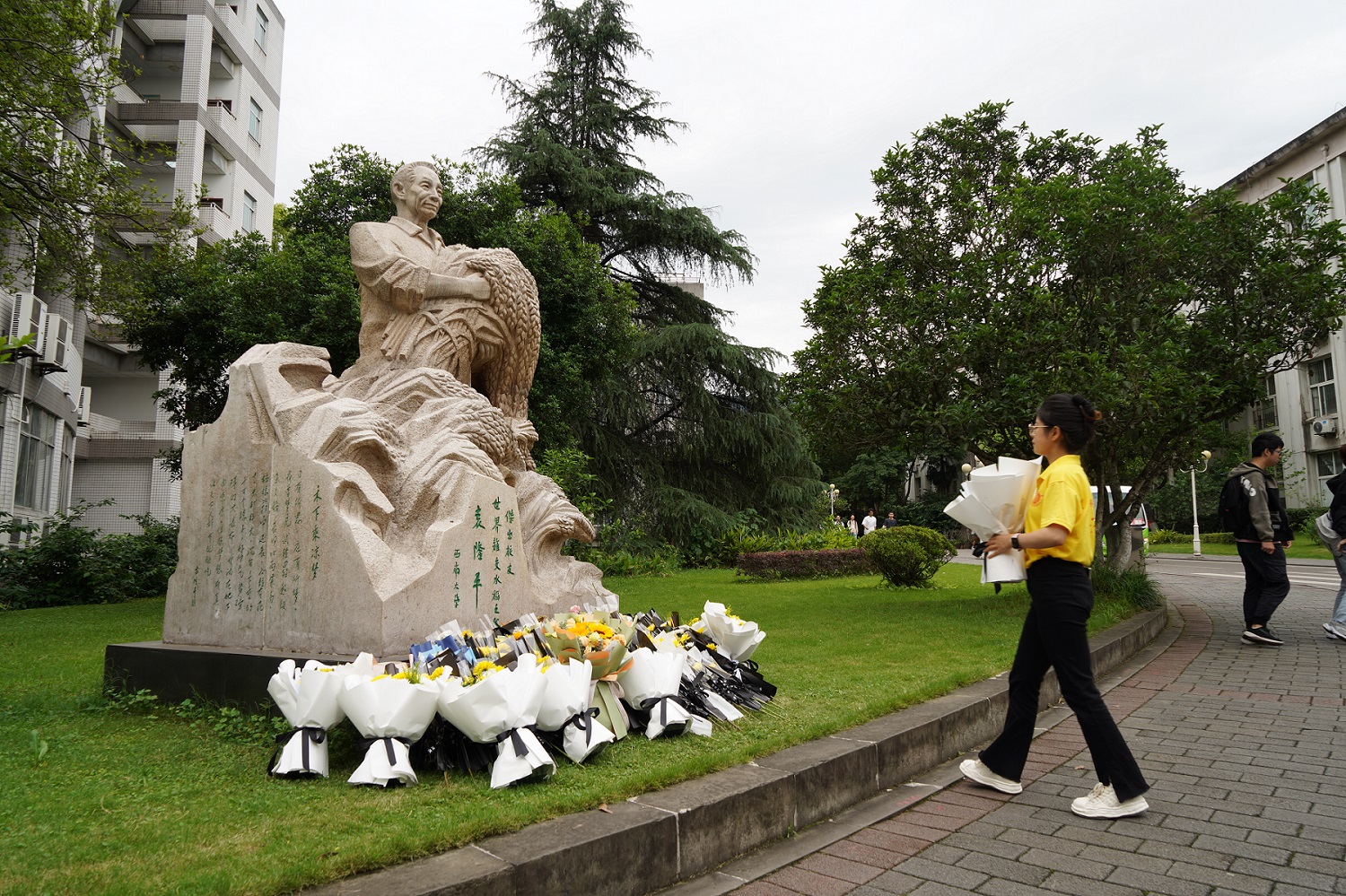一生躬耕田间,换得稻香丰年的袁隆平院士是“共和国勋章”获得者,是“杂交水稻之父”,是让中国人“端牢饭碗”的英雄,在西南大学学子心中,他更是大家的好学长、好老师。5月22日清晨,众多师生自发来到袁隆平院士雕塑前寄托哀思、敬献鲜花、汇报学业。他们当中,有美术学院、文学院的学生带来了为隆平学长所作的画像、题写的书法作品,有农学与生物科技学院“袁隆平奖学金”获得者前来敬献鲜花,还有资源环境学院学生手捧培育的沃土来表达追思……袁隆平院士勇于创新、无私奉献的精神永驻西南大学师生心间。