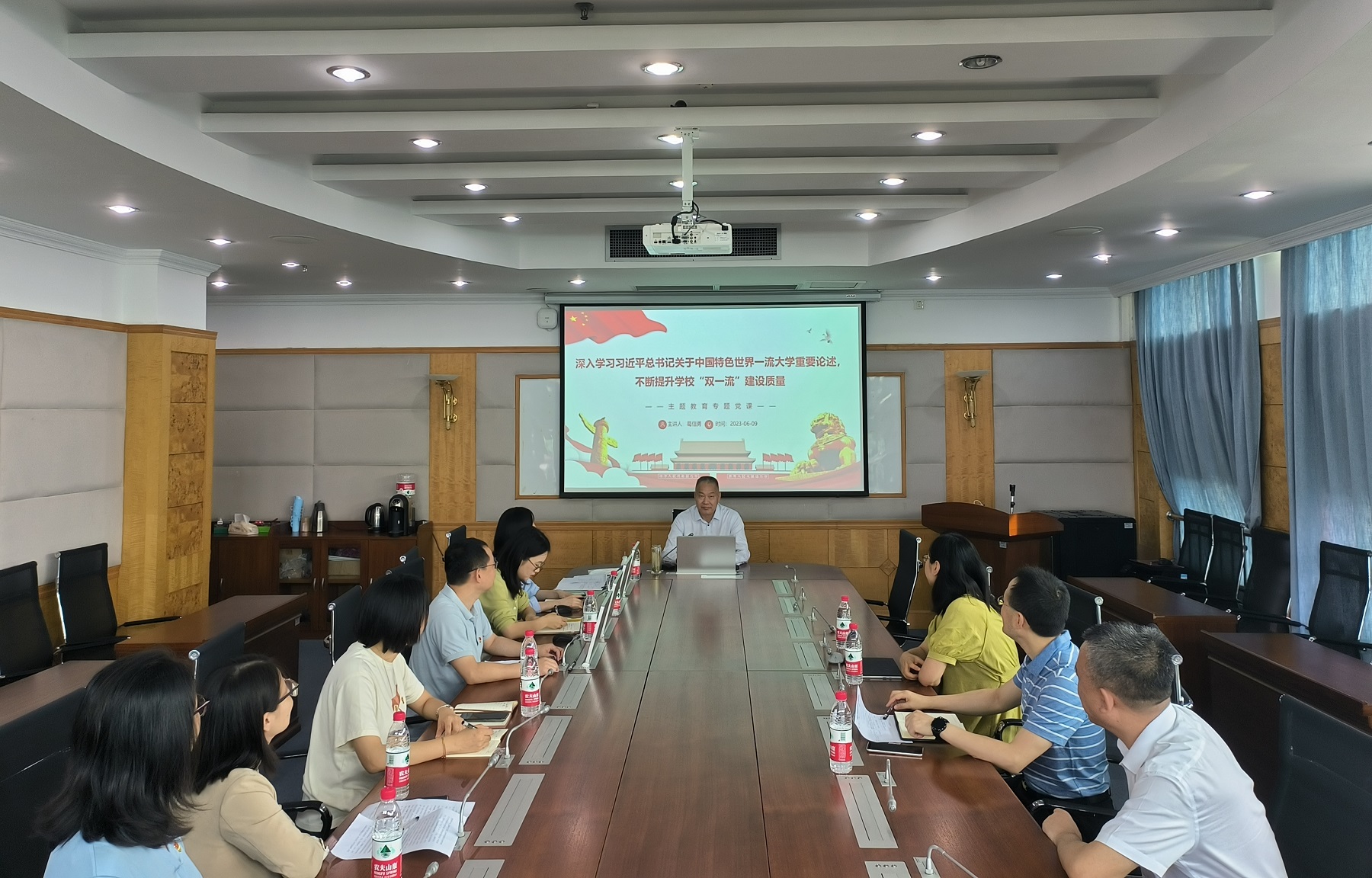 为深入推进学习贯彻习近平新时代中国特色社会主义思想主题教育走深走实,6月9日上午,副校长葛信勇讲授《深入学习习近平总书记关于中国特色世界一流大学重要论述,不断提升学校“双一流”建设质量》专题党课,发展规划与学科建设部党支部全体党员参加党课学习。