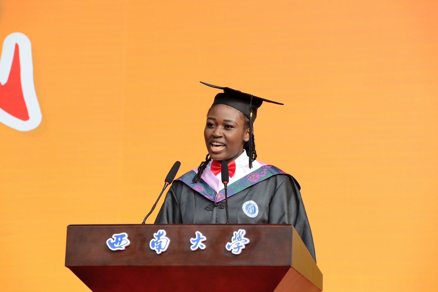 来自尼日利亚的毕业留学生代表,国际学院19级汉语言文学专业陈悦同学分享自己在西南大学学习中文、爱上中文、感受中文之美的求学故事,号召留学生们探索传统文化魅力,涵养文化传播能力,讲好“中国故事”,将充满魅力的中国文化带向世界。