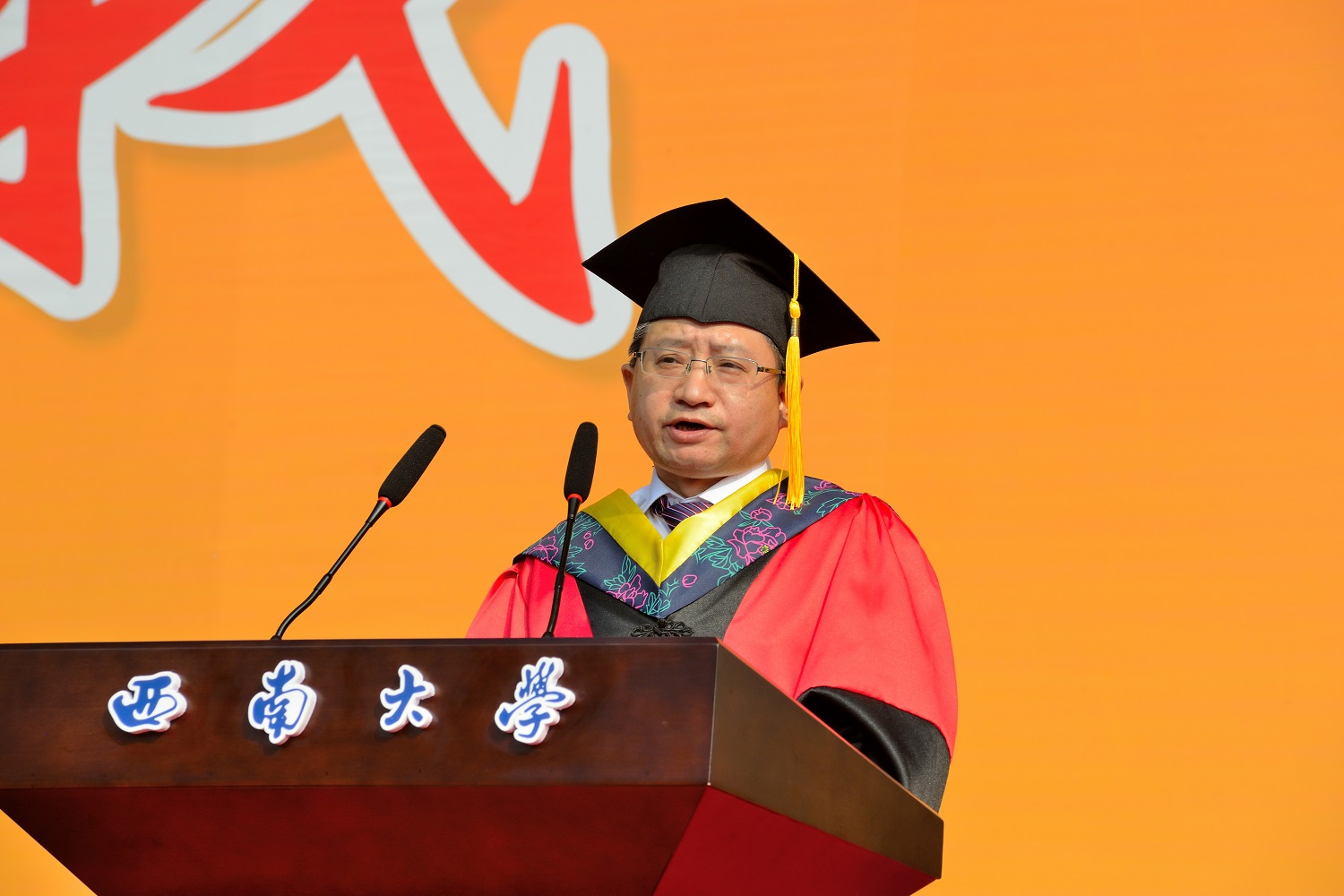 学校党委书记李旭锋宣读有关毕业、授位和表彰的决定。根据学校有关学籍管理规定,经学校审核、研究决定:准予9325名应届全日制普通本科学生毕业,准予76名应届全日制来华留学本科生毕业。经校学位评定委员会全体委员会议审核,决定授予9376名普通高等教育本科毕业生学士学位,授予3968名高等学历继续教育本科毕业生学士学位,授予1039名普通高等教育本科毕业生辅修专业学士学位,授予89名来华留学本科毕业生学士学位。经评审,97名本科生被评为重庆市优秀毕业生,1468名本科生被评为西南大学优秀毕业生,339名本科生被评为西南大学优秀师范毕业生,25名本科生被评为西南大学优秀来华留学本科毕业生。