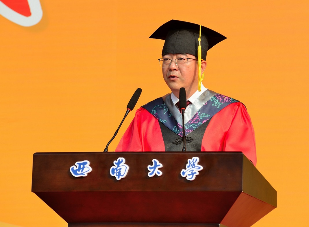校长张卫国以“让奋斗成为人生的主旋律”为题深情寄语毕业生。他带领2023届毕业生回顾了大学四年的“独家记忆”,为大家在学业、创新实践等方面的优异表现点赞,向全体毕业生表示热烈祝贺,向培育学子成长成才的老师、家长、校友和各界人士表达最衷心的感谢。他寄语毕业生要勇于在变局中开拓人生新局,在进入“舒适区”时,敢于“跨栏”而出,面对“死胡同”时,善于择路而行;要敢于在平凡中铸就人生不凡,锤炼本领于日常,追求卓越于精微,品味甘甜于苦涩;要善于在作为中砥砺人生修为,自律自励、与人为善,慎独慎微、恪守正道,饮水思源、心怀感恩。张卫国勉励毕业生坚守西大人的风骨、才情和气派,将奋斗当作人生的主旋律,既怀抱梦想又脚踏实地,既敢想敢为又善作善成,在强国逐梦的大好时代里,绘就出壮美的人生画卷。