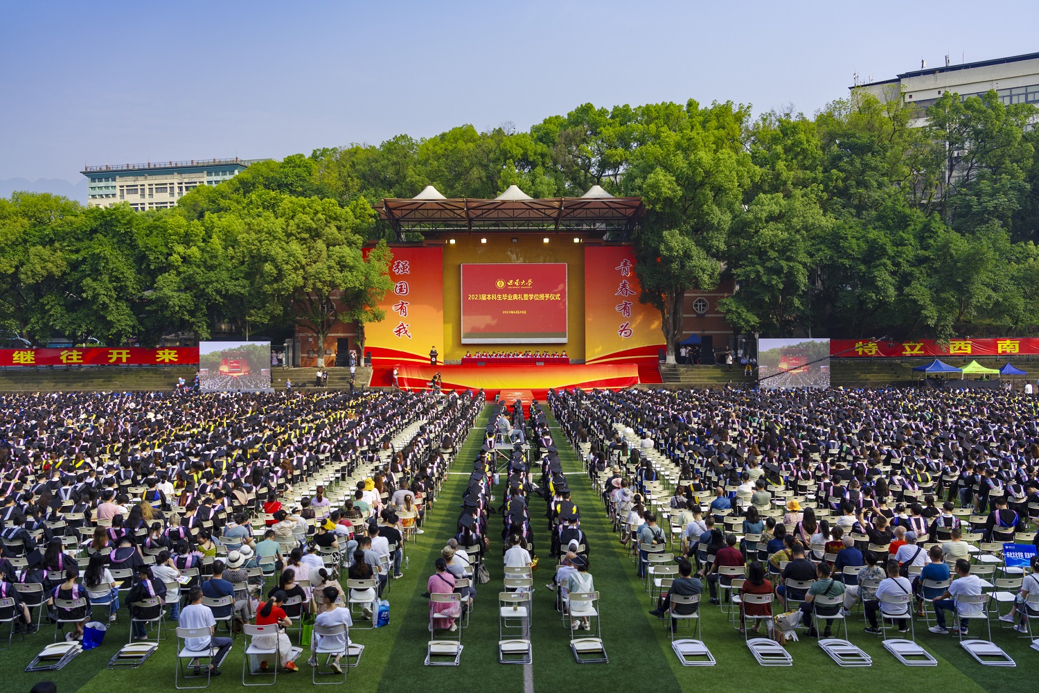 青春正当时,梦想新起航。6月20日上午,学校在北碚校区第一运动场和荣昌校区学生活动中心同步举行2023届本科生毕业典礼暨学位授予仪式。9401名毕业生圆满结束大学生活,开启人生新篇章。
