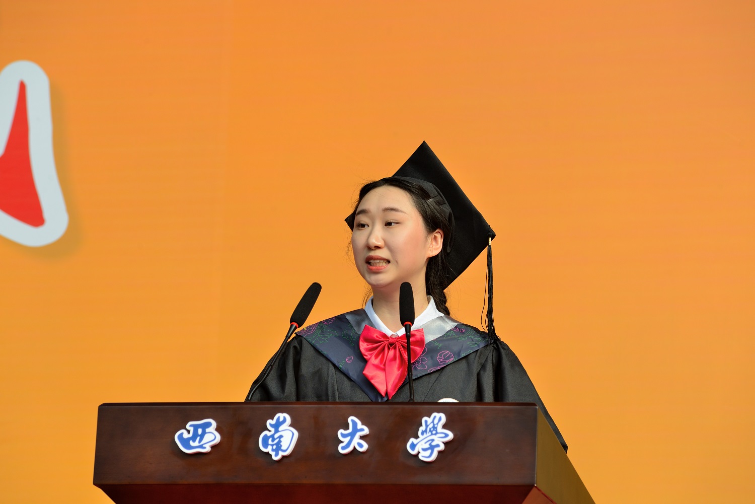 毕业生代表创新创业学院(含弘学院)胡云桐同学分享自己道阻且长、行而不辍的学习科研经历,号召同学们怀揣热爱、踔厉奋发,在时代浪潮中贡献青春力量,共续西大荣光。