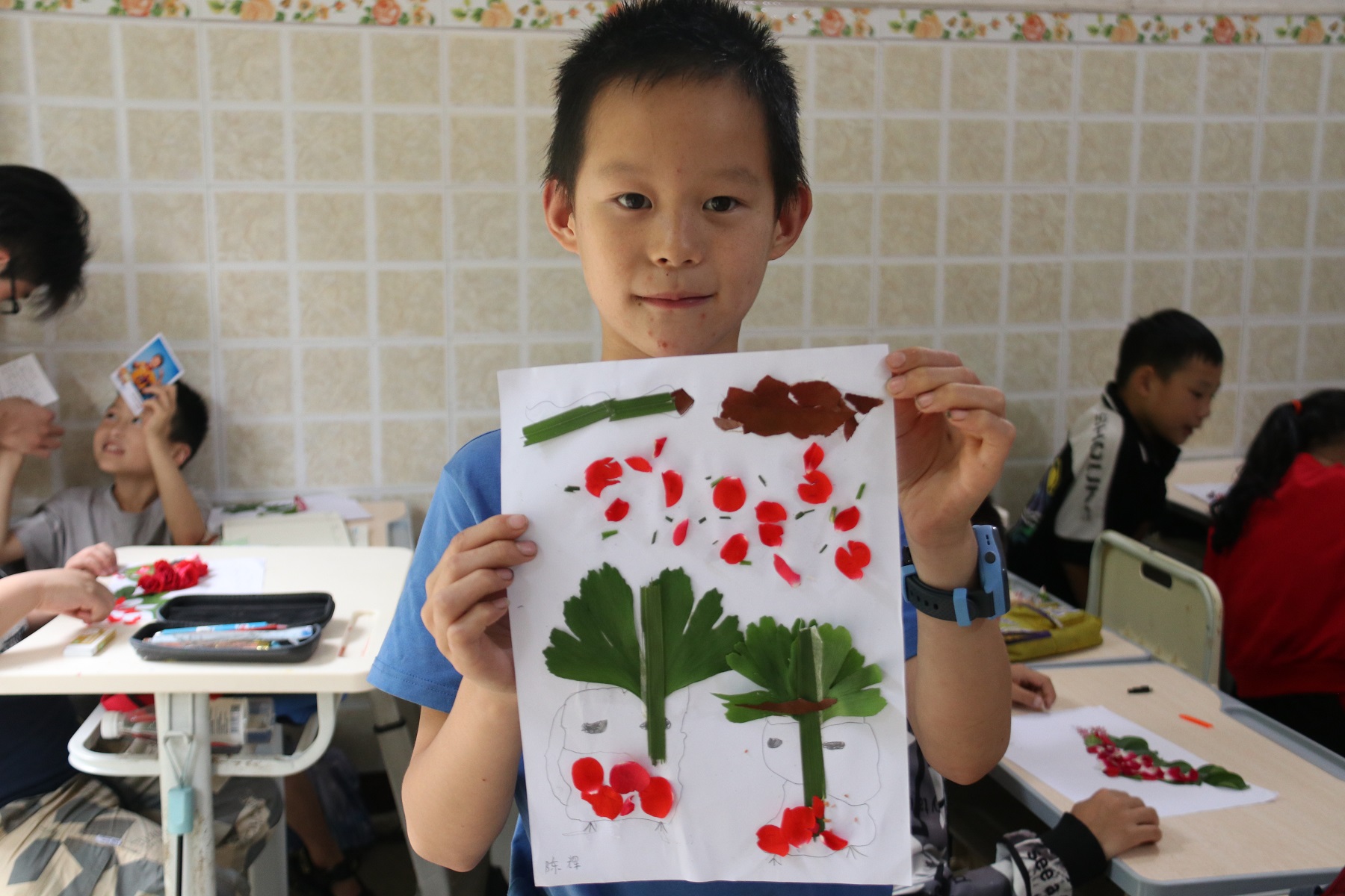 本次“西小兰”助力乡村振兴实践团着力聚焦素质教育,借助当地丰富的自然植被资源,开展了植物拼贴画创意美术课程。在老师的引导下,孩子们从乡村的田间地头取材,把收集到的植物以拼贴方式描绘出自己喜欢的图案。或是路边的一朵小花,或是田野的小草……通过孩子们极富想象力的创新,各种形象跃然纸上,变成了一幅幅精美的艺术品。