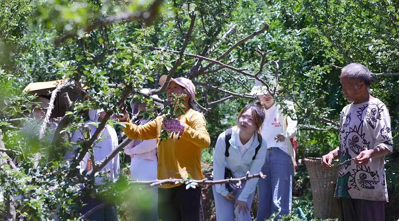 7月3日至7月5日,“育见·云滇”社会实践团队成员先后来到龙头山镇光明村花椒产业基地、西梅种植园、仙桃种植基地等特色产业基地进行实地调研。烈日炎炎,花椒地里,村民们正热火朝天地忙碌着,团队成员们也加入其中,亲身体验齐心协力、为幸福生活艰苦奋斗的美好。在参与劳动实践的过程中,队员们不仅体会到了光明村人民助力乡村振兴筚路蓝缕,也坚定了自身勇挑时代重担、奉献青春力量的决心。