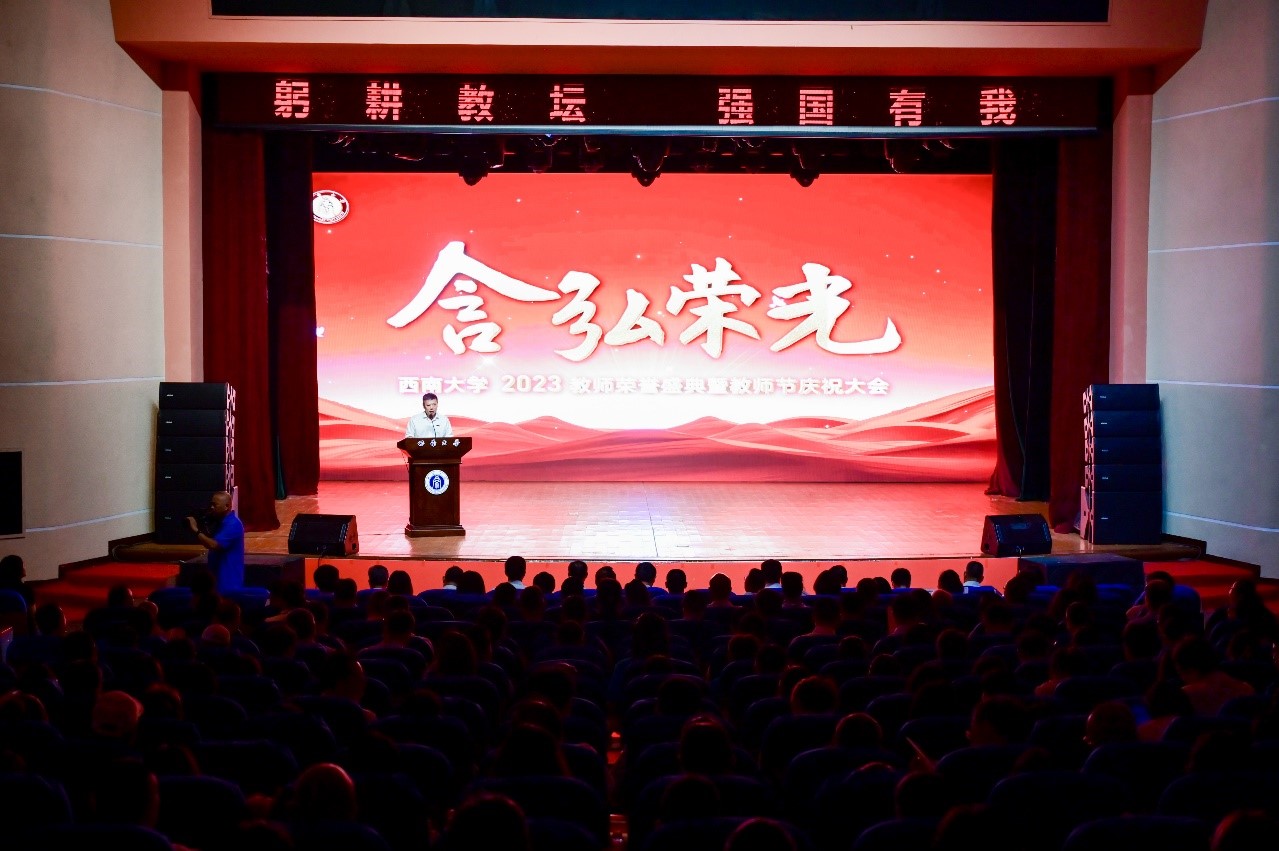9月8日,学校在光大礼堂举行“含弘荣光”——西南大学2023教师荣誉盛典暨教师节庆祝大会。学校领导、各单位负责人,2022—2023学年度从教30年教职工、退休教职工、国家级和省部级荣誉称号获得者、新晋国家级人才、新聘含弘人才岗教师、新进教师,以及教师和学生代表参加了庆祝大会。