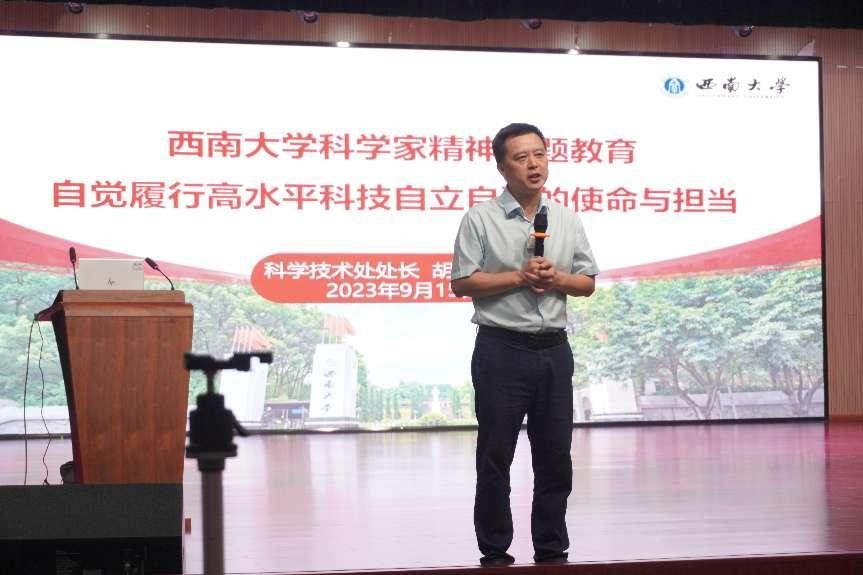 为继承发扬以国家民族命运为己任的爱国主义精神,发扬以爱国主义为底色的科学家精神,推动新时代科技强国建设,9月15日,学校在圆顶三楼报告厅举行博士研究生新生入学教育之传承科学家精神主题教育活动。党委常委、副校长王进军,党委研究生工作部、科学技术处、科协、北碚区科协相关负责人及学校2023级全体在校博士研究生参会。会议由党委研究生工作部部长秦松主持。