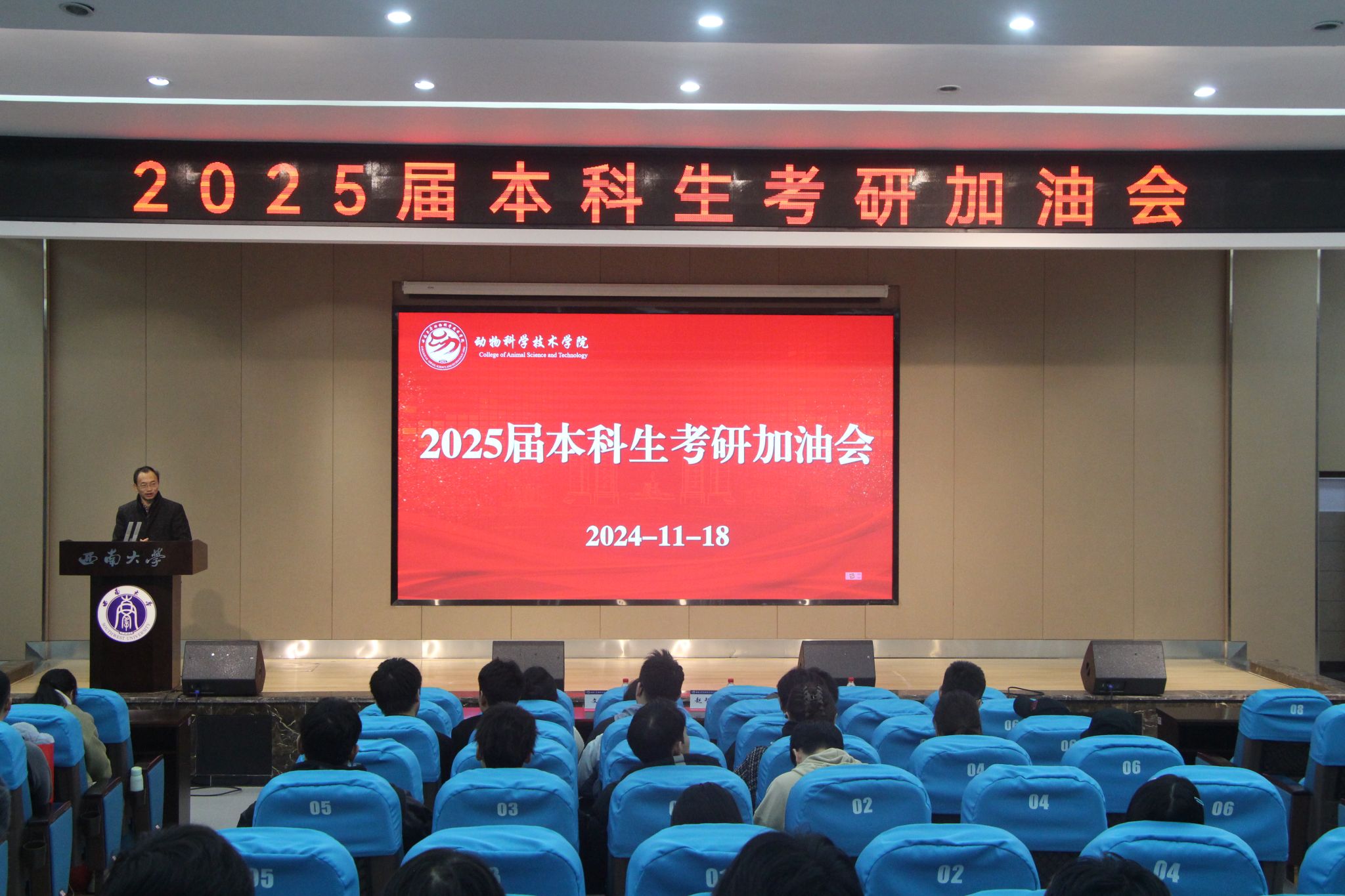 为增强考研学子备考信心、助力考研学子成功上岸,11月18日,动物科学技术学院召开2021级本科考研加油会。学院党委副书记、纪委书记文武,2021级本科生辅导员、班主任和全体考研学生参加会议,会议分别由朱恒宇、欧雪婷主持。