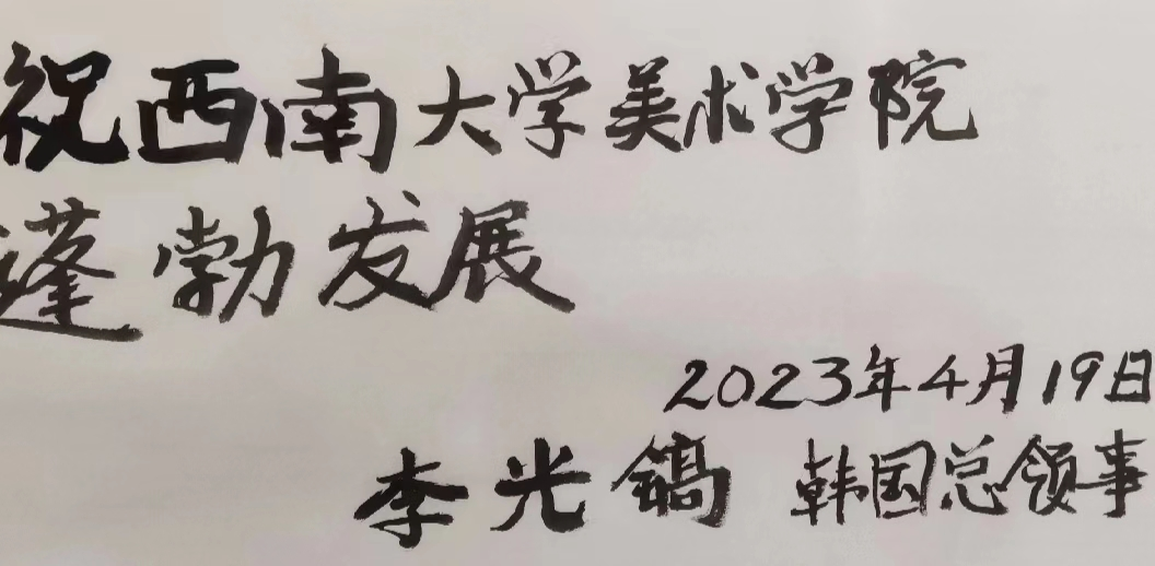 李光镐总领事对学院师生近年来和韩国相关高校进行的深度学术交流表示肯定,并向学院在进一步加强中韩文化交流、做好艺术创新和加强人才联合培养等方面提出殷切期望。同行领事和领馆人员对学院在人才培养和文化传播方面所做的工作表示高度认可。大家认为,西南大学美术学院文化底蕴深厚,人才培养扎实,学术成果丰硕,社会服务宽广,在服务中韩文化交流、推动艺术学专业发展、打造世界知名专业院校发挥着重要作用。与会人员就教师访学深造、研究生联合培养、本科人才培养、文化艺术推广、学术成果转化和人才交流等方面进行了深入交流。李光镐总领事提笔为学院写下“祝西南大学美术学院蓬勃发展”,祝愿美术学院未来更美好。