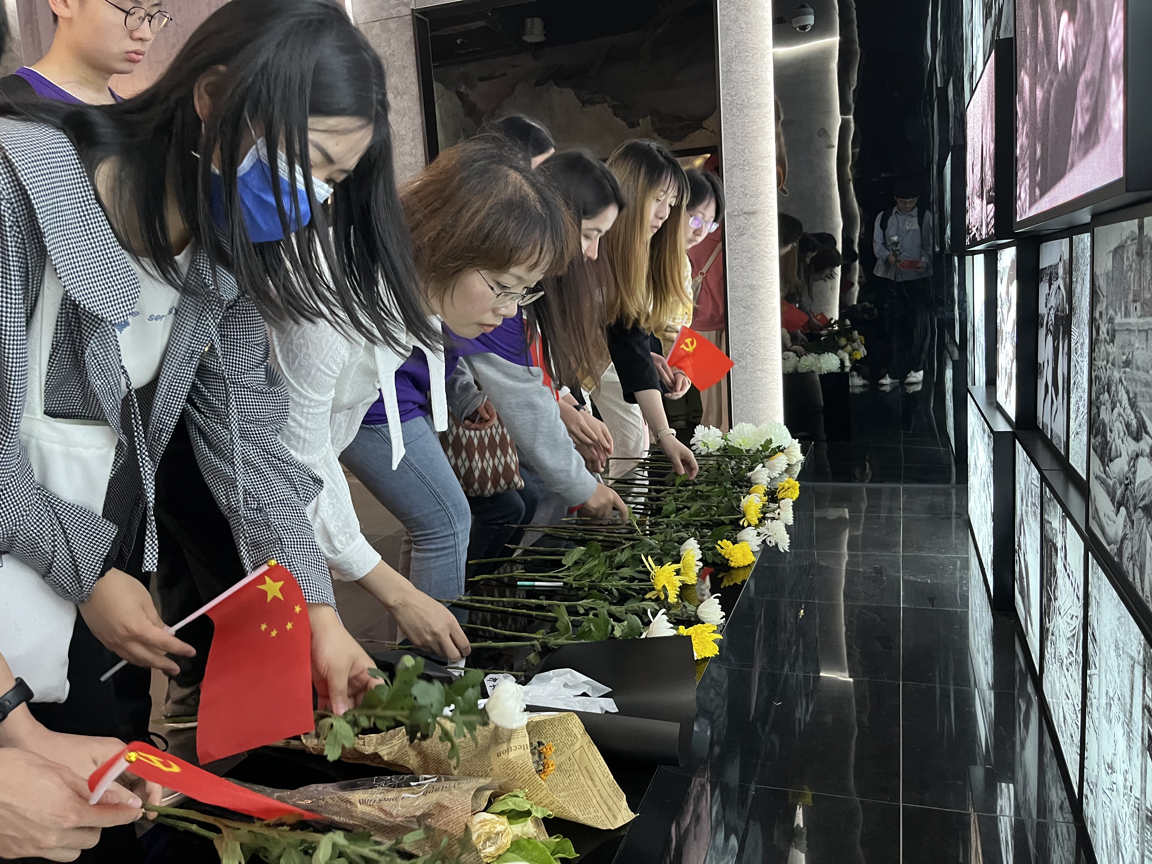 随后,学生们参观了重庆大轰炸“六·五”隧道惨案史实展。在精彩解说与纪实影片配合之下,大轰炸之惨烈得以再现,而侵略者对于生命的漠视也被揭露。亲身走过昏暗拥挤、空气稀薄的地下隧道,大家更为受难者的无助与绝望而悲痛交加。面对排满受难者照片的展壁,全员鞠躬默哀,一一献花悼念。