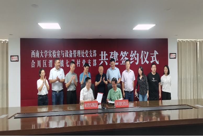 为充分发挥基层党建的核心引领作用,巩固乡村振兴发展成果,构建结对帮带、双向促进、共同提高的基层党建工作新格局,9月14日下午,西南大学实验室建设与设备管理处党支部与重庆市合川区渭沱镇七星村党支部签订了支部共建协议。实验室建设与设备管理处党支部书记卢坤、合川区渭沱镇党委书记唐陵川、镇长秦刚等领导及双方党员代表参加本次签约仪式。