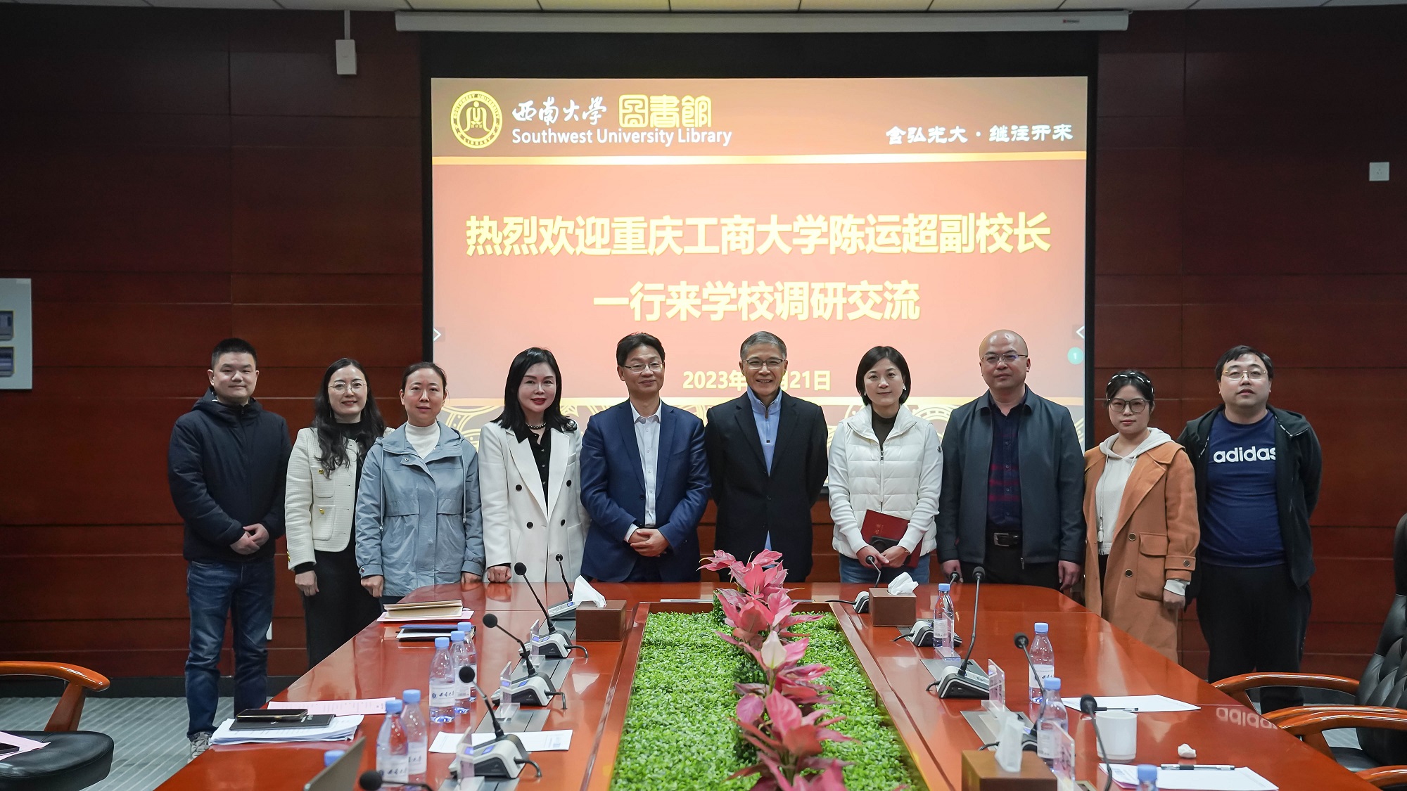 11月21日下午,重庆工商大学副校长陈运超,图书馆馆长王燕,采购与招投标管理中心副主任杨徐勇等一行5人来校调研交流,学校副校长周光明和采购与招投标管理中心、图书馆负责人一起在行署楼A栋第二会议室接待了来访团队并进行交流。随后,陈运超一行又到中心图书馆进行实地考察座谈,学校采购与招投标管理中心万劲、副主任周雪敏、货物采购管理科科长袁用军,图书馆党委书记梁大明、副馆长黄敏、党务与宣教中心主任李菁参加此次座谈。座谈会由梁大明书记主持。