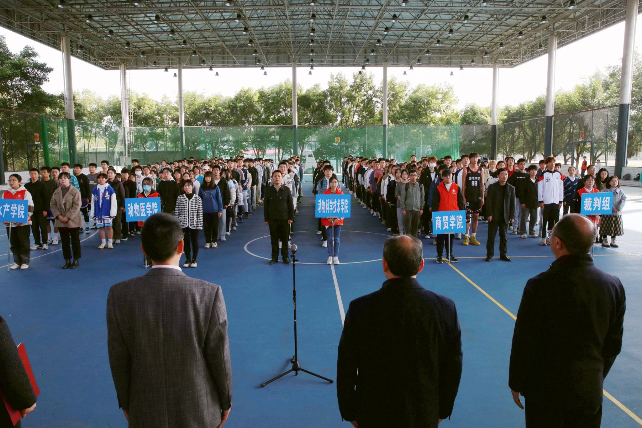 11月17日14:30,由西南大学体育运动委员会、西南大学荣昌校区党工委、管委会主办,西南大学荣昌校区学生工作办公室承办的西南大学荣昌校区第十九届“团建杯”球类联赛在荣昌校区风雨球场开幕。荣昌校区党工委书记周国安,荣昌校区党工委副书记、纪工委书记穆奎,荣昌校区综合办公室主任杨德生,在荣各学院党委副书记、团委书记及全体运动员、裁判员和在荣学院学生代表等参加开幕式,学校党委学生工作部(处)副部(处)长、荣昌校区学生工作办公室主任罗艳芬主持开幕式。