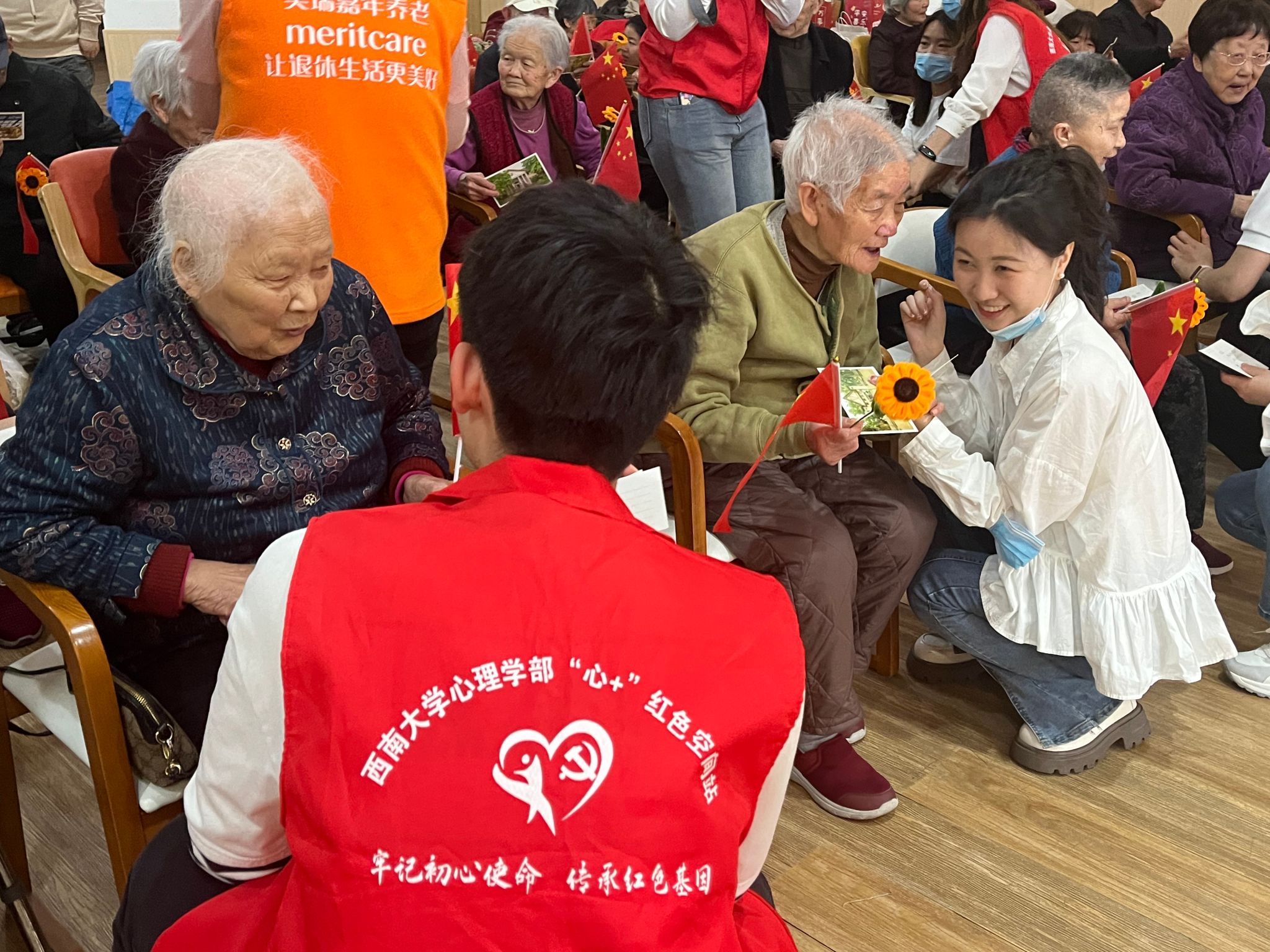 服务点的成立不仅为老年人提供了一个心理关爱的平台,也为党员志愿者提供了一个实践和锻炼的机会。当日,西南大学心理学部20余名志愿者在服务点开展了“红岩先锋志愿行 初心公益暖夕阳”两会精神微宣讲暨敬老爱老志愿服务活动。心理学部学生党建组织“心+”红色空间站站长丁汝向老年人进行了两会精神微宣讲,讲解了2024年全国两会中关于养老的议题政策,心理学部睡眠神经影像中心学生金巧进行了“宁心助眠”心理健康知识小讲堂,帮助老年人和养老服务工作者了解关于睡眠的心理学知识,并现场教授了深呼吸放松训练、正念冥想助眠等改善睡眠质量的实用技巧。“心+”红色空间站成员和各党支部志愿者与老年人进行“心灵驿站”交流,用明信片为老人们送上和煦温暖的“春日来信”,向老人分享自己所感受的美好春天,互动中或为老人捏捏肩、捶捶背,或仔细聆听老人诉说往事、说烦忧,让老人感受到春天般的温暖和舒适。活动中还穿插了志愿者们精心准备的古筝演奏、歌曲合唱等文艺表演。随着活动的进行,老人的孤独感渐渐得到排解,绽放出幸福的笑容。