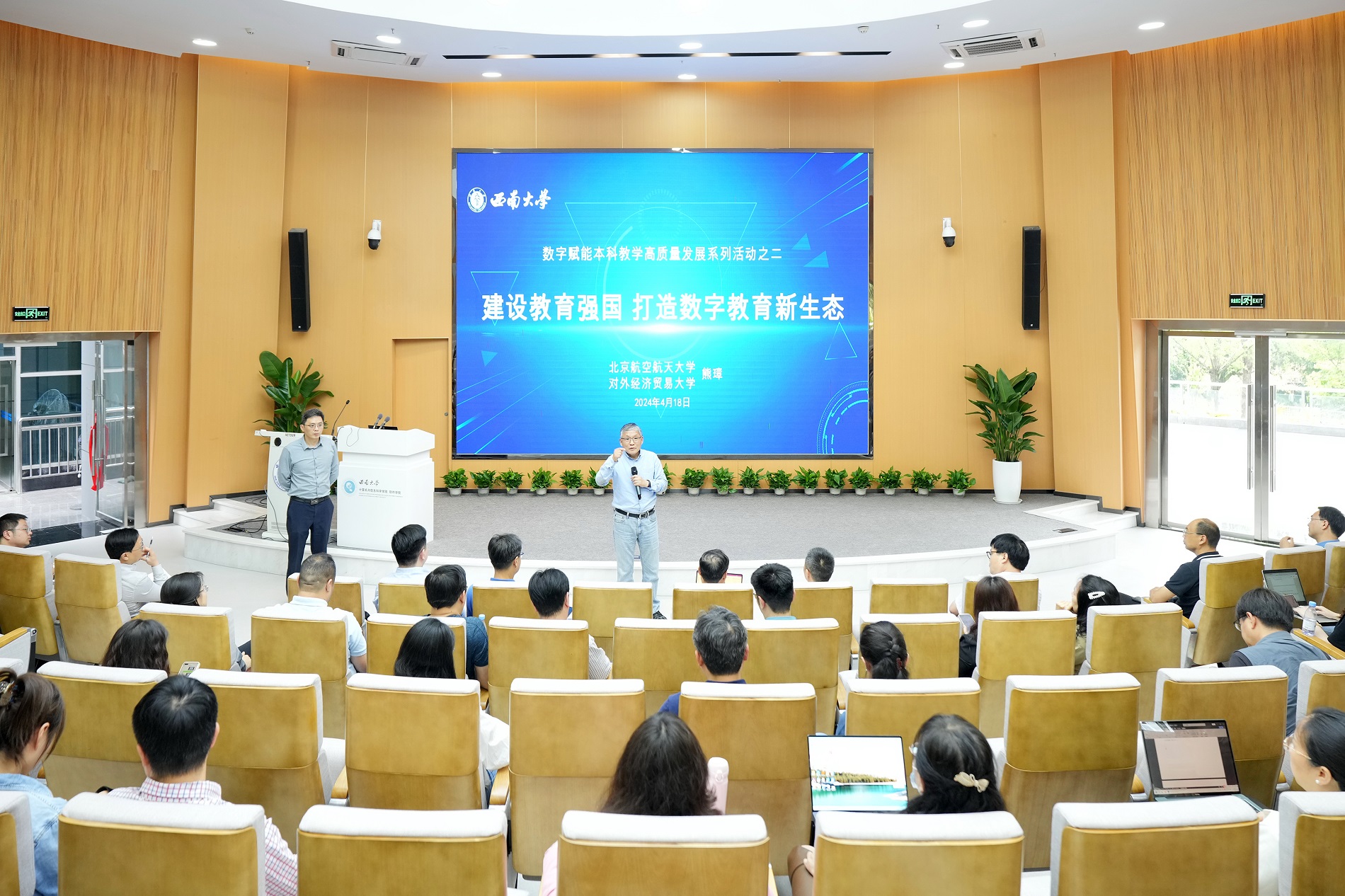 为全面贯彻落实教育数字化战略行动,进一步推进教育教学数字化转型,助力广大教师应对数字化时代教学挑战,4月18日下午,学校举办“数字赋能本科教学高质量发展”系列活动第二场,国家教育数字化专家咨询委员会委员、对外经济贸易大学信息学院院长熊璋教授做主题讲座。副校长周光明出席活动并讲话,讲座由教务处处长付志锋主持。