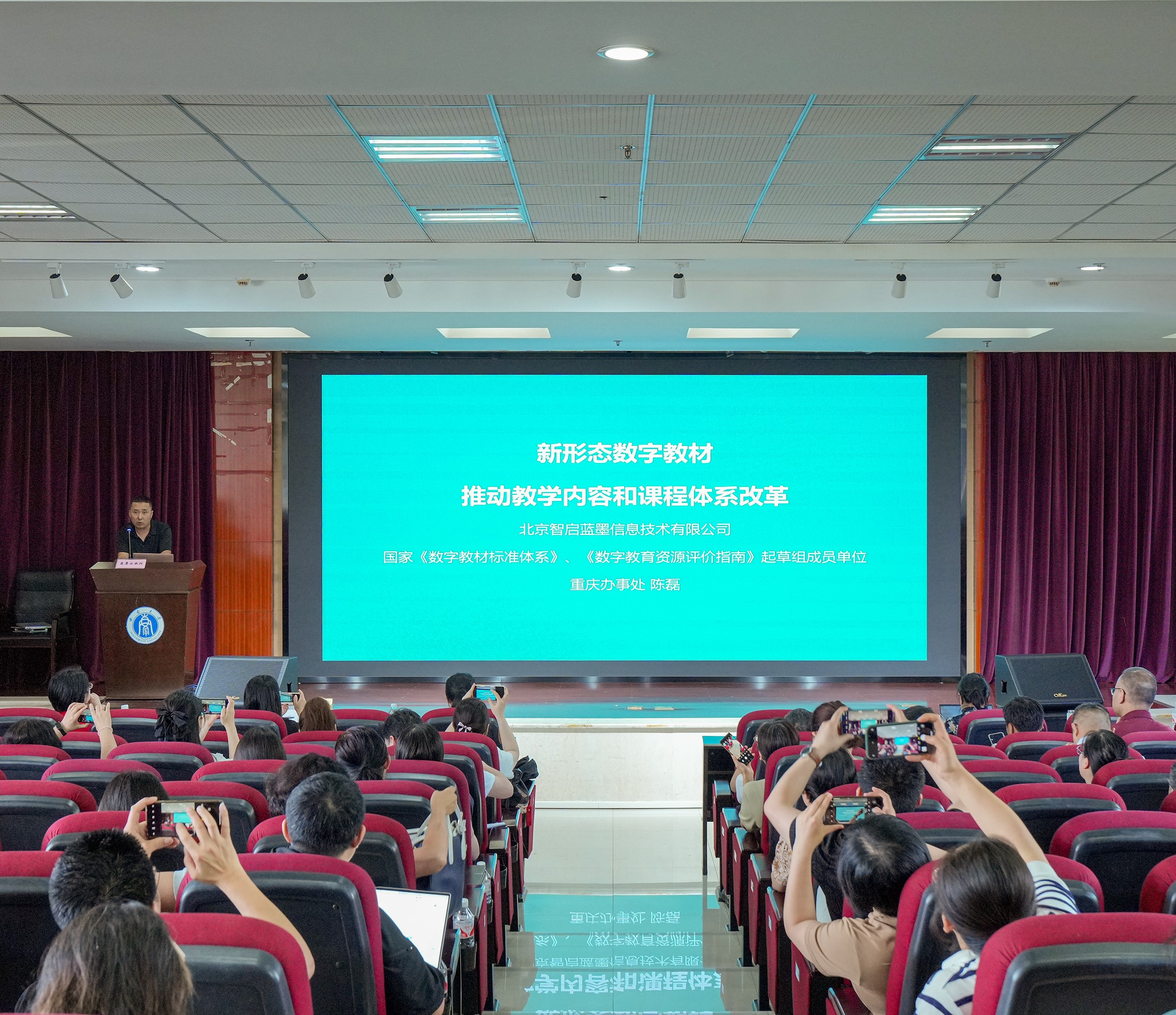 蓝墨云教材重庆办事处主任陈磊作了题为“推动教学内容和课程体系改革 数字教材智能一体化服务体系”的专题报告,介绍了利用在线编辑器自主创作数字教材的方法,展示了新形态数字教材建设和应用的优秀案例,并为现场教师答疑解惑。