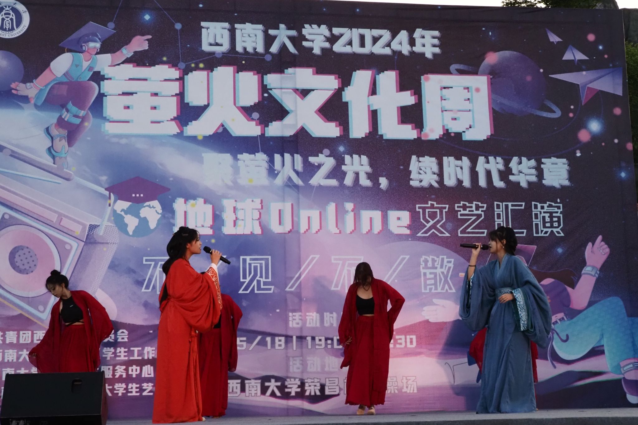 当晚19:00,“地球 online!上线冒险!”文艺展演惊艳亮相。好事多磨终成事,佳期难得自有期,作为萤火文化周活动的启幕之作,虽因天气展演时间稍有调整,但演出的热情分毫未减。表演人员在舞台上尽情挥洒才华,凭借精湛的技艺和独特的创意,将舞台变成了充满魅力的艺术空间,为校区师生带来了一场视听盛宴。