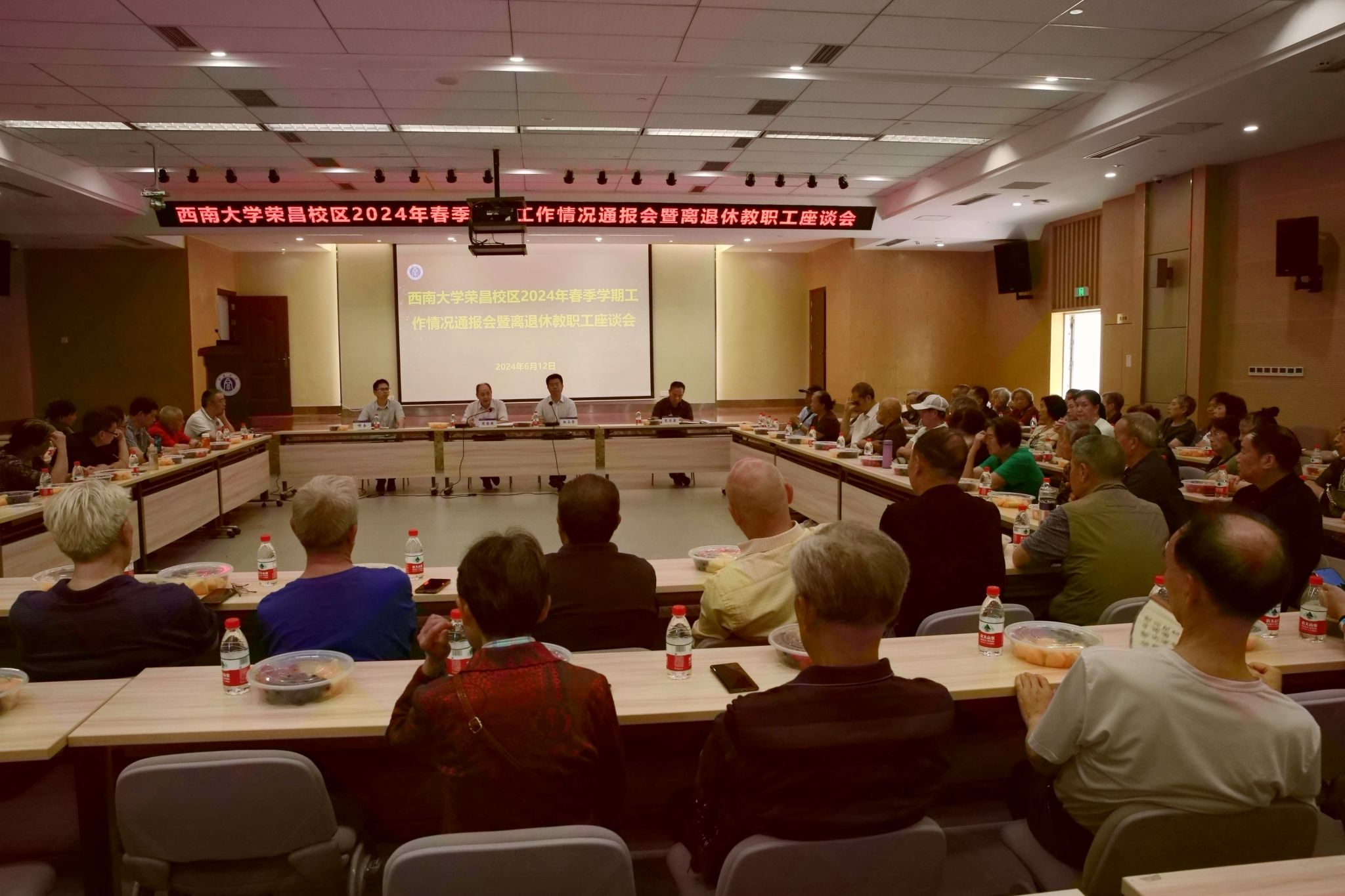 6月12日,西南大学荣昌校区2024年春季学期工作情况通报会暨离退休教职工座谈会在7B101报告厅举行,校区管委会主任赵永聚主持会议,校区党工委书记周国安通报工作情况。校区党工委副书记、纪工委书记穆奎,副处级组织员包尔泉出席会议,离退休工作办公室全体工作人员及70余名离退休教职工参加会议。