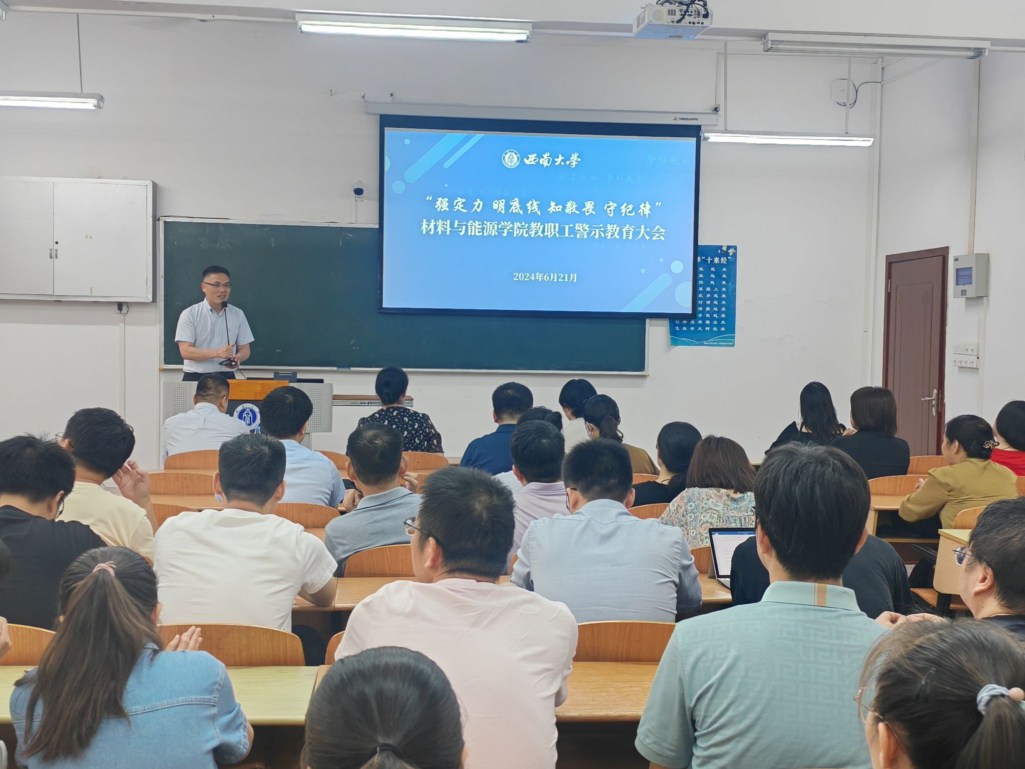2024年6月21日,材料与能源学院召开“强定力 明底线 知敬畏 守纪律”教职工警示教育大会,进一步推动党纪学习教育走深走实、入脑入心,以案为鉴、警钟长鸣。学院全体教职工参加会议,会议由党委书记梁武主持。