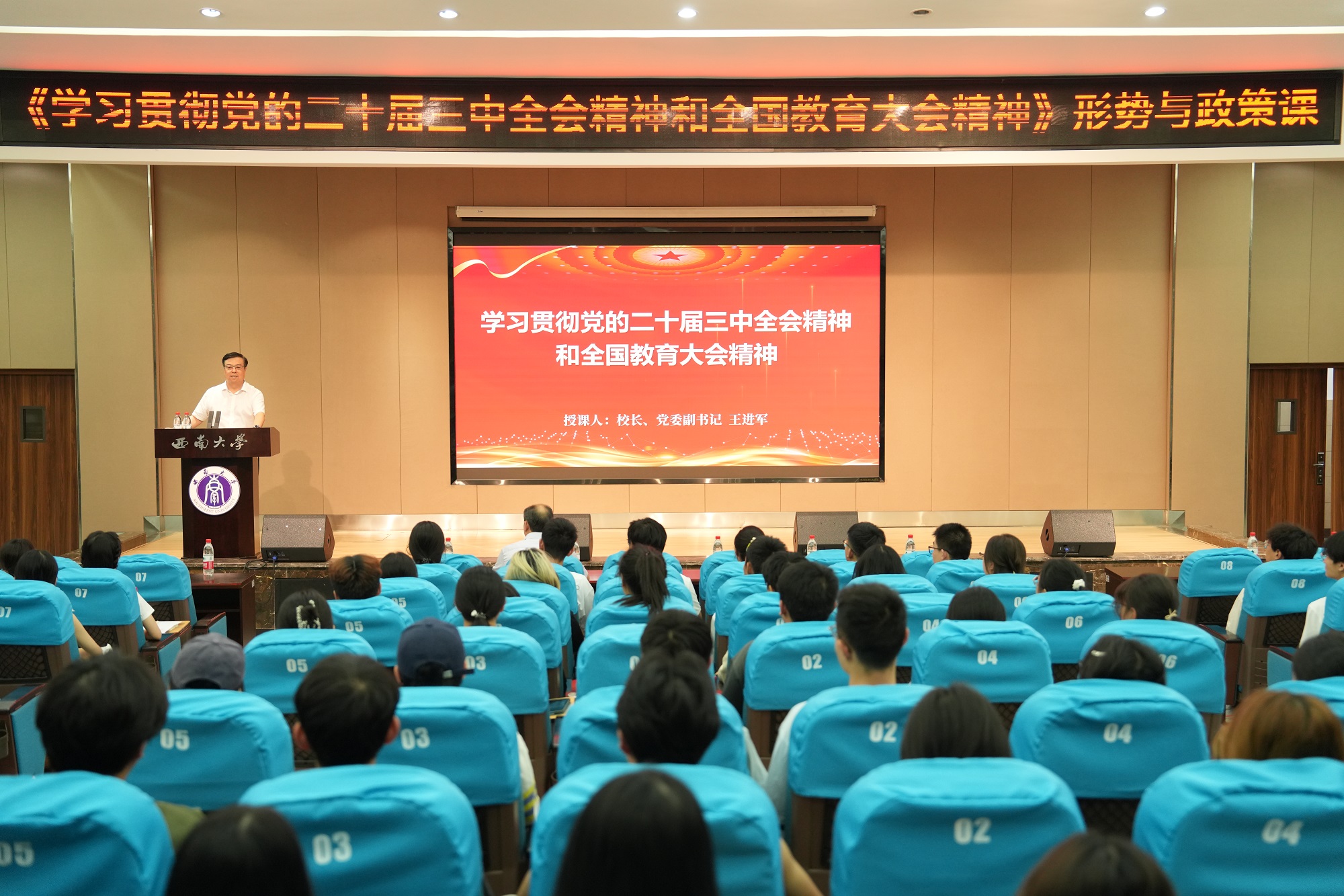 王进军的讲授从深入学习领会习近平总书记在党的二十届三中全会上的重要讲话精神、全面准确理解《决定》提出的进一步全面深化改革重大举措以及习近平总书记在全国教育大会上的讲话深刻阐释了教育强国的科学内涵和基本路径、深刻阐述了教育强国建设要正确处理好的重大关系、系统部署了全面推进教育强国建设的战略任务和重大举措等方面内容展开,进一步明确提出“教育强国、西大何为”的目标、任务和举措路径。他强调,要把学习贯彻党的二十届三中全会和全国教育大会精神同学习贯彻习近平总书记视察重庆重要讲话重要指示精神结合起来,深学笃行习近平总书记关于全面深化改革的一系列新思想、新观点、新论断,高举改革旗帜,凝聚改革合力,直面问题攻坚克难,敢为人先大胆探索,唯实争先狠抓落实,以进一步全面深化改革的实干实绩实效奋力谱写加快建设教育强国的西大答卷!