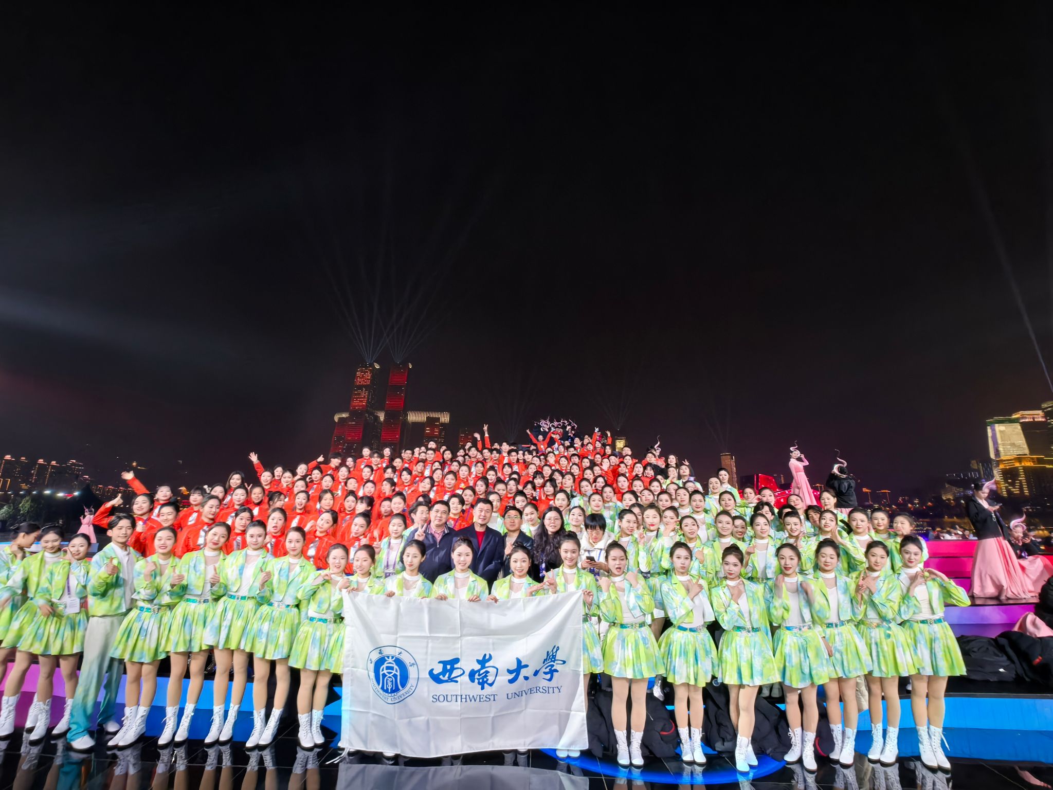 在为期一个多月的排演中,演职人员克服低温严寒、高强度排练、推迟返家等重重困难,以高度负责的专业精神和精益求精的艺术追求,赢得了央视春晚重庆分会场导演组的一致好评,完美诠释了“坚韧、忠勇、开放、争先”的重庆城市精神,集中展现了学校“特立西南、学行天下”的大学精神。