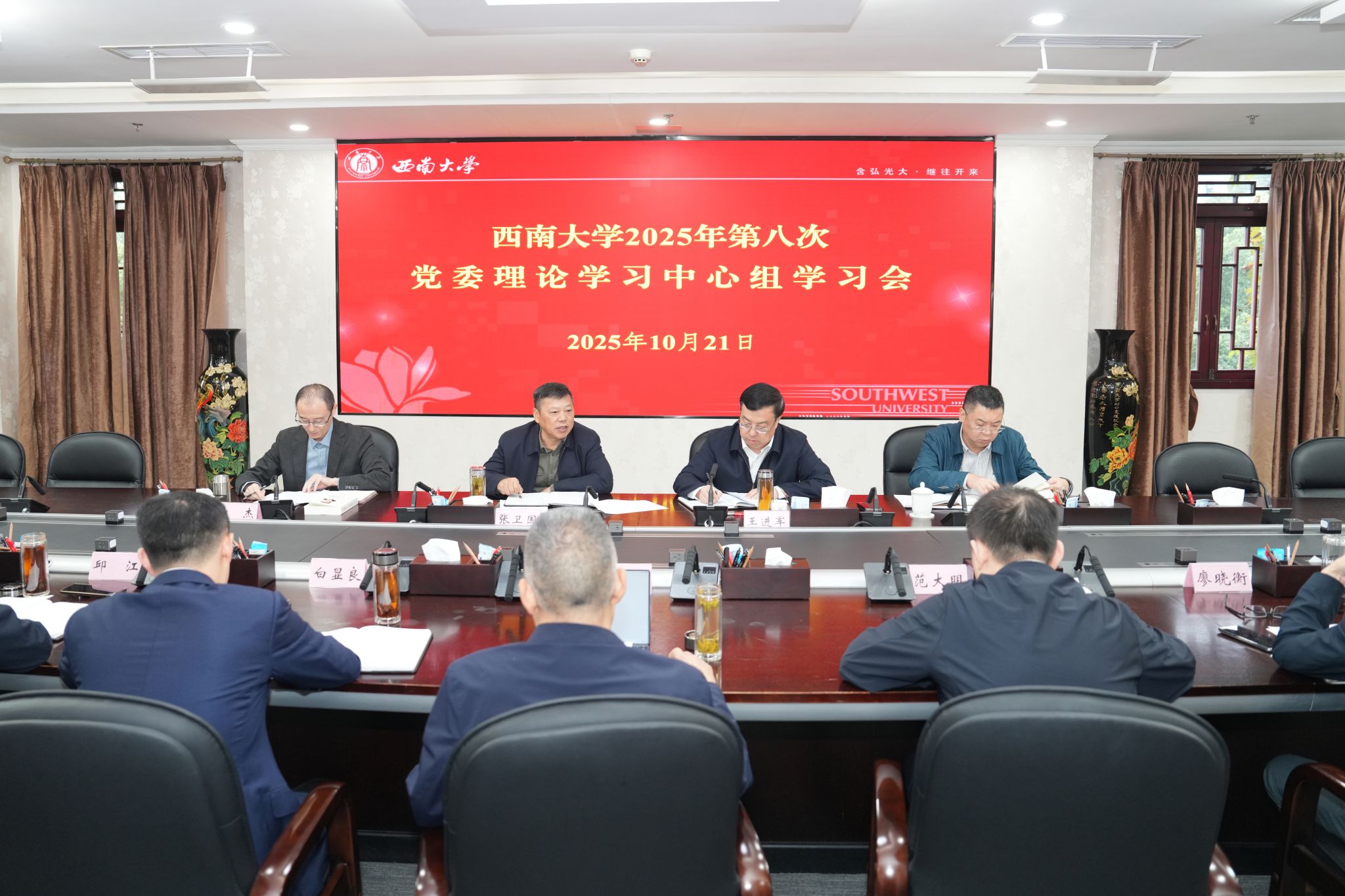 10月21日上午,学校召开2025年第八次党委理论学习中心组学习会,专题学习研讨《习近平谈治国理政》第五卷,党委书记张卫国主持会议并讲话。
